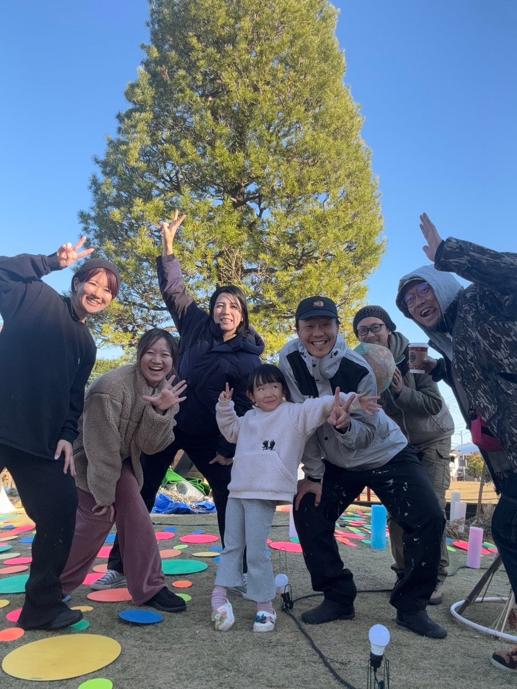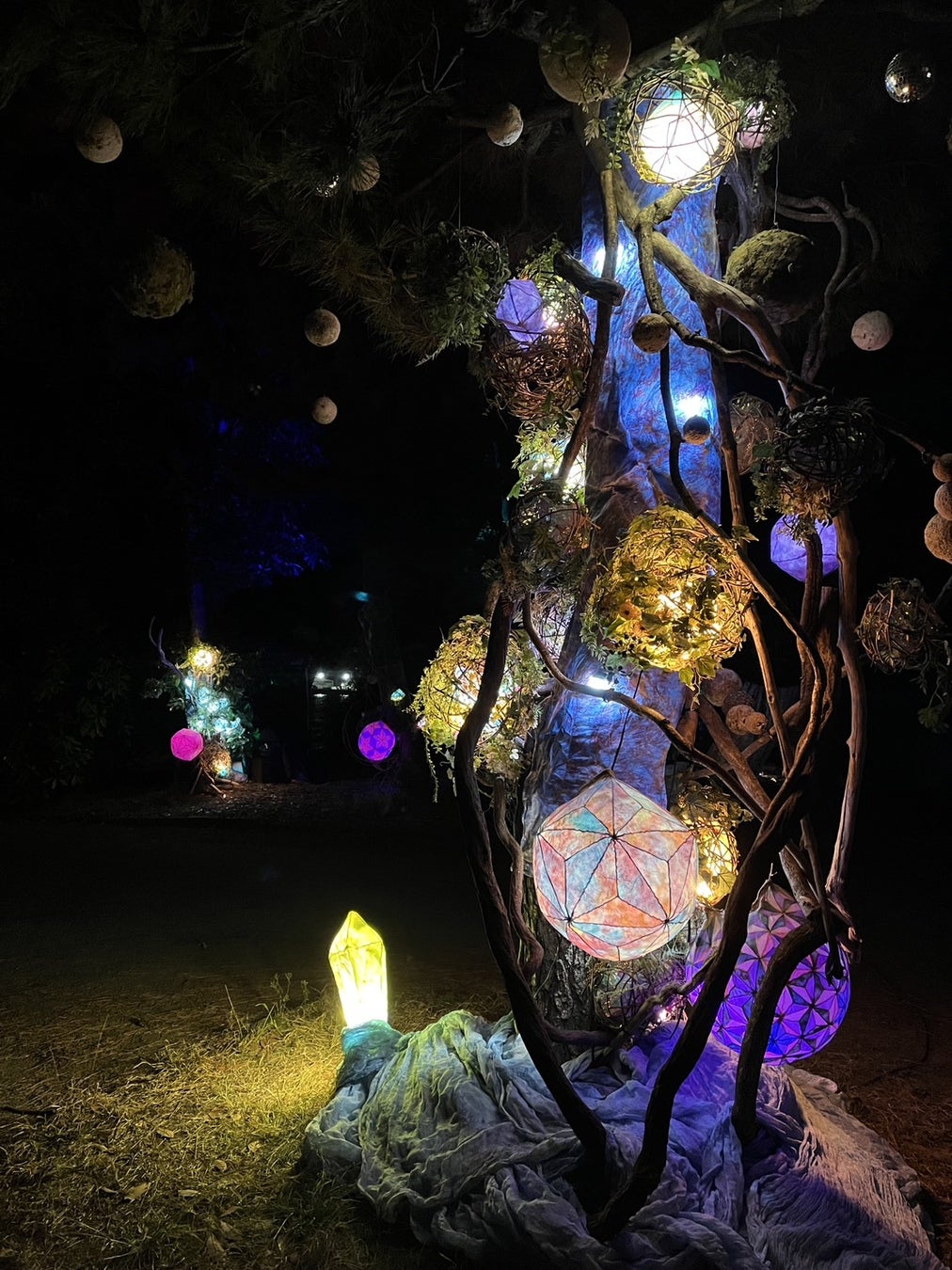 昨年のイルミネーション制作ではそれぞれの作家の持ち場が明確でしたが、今年は現場で作家どうしがセッションしながら作り上げるスタイルがかなり強めになりました。すなわち「ライトアップ2024-2025」の芝生エリアは「球体」という作品コンセプトに基づき4人のアーティストが混ざり合う「共演協作スタイル」で仕上がっています。そこには作家同士が意見を出し合う中で、多少ズレが生じたとしても、時間をかけてお互いが表現したいことを汲み取り、内包する姿がありました。そんな制作過程があるからこそ、見た目にも温かみが滲む作品になったと思います。このメンツで、今だから生みだせた、そういう作品になっています。