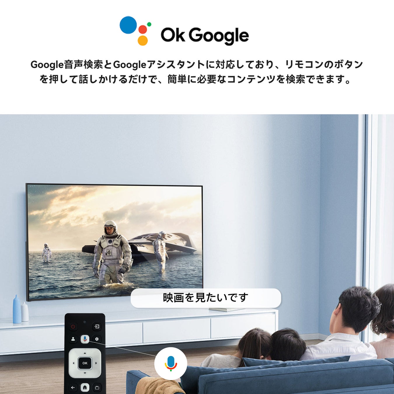 リモコンの音声ボタンを長押しし、「Ok Google」と話しかけるだけで、テレビを簡単に操作できます。スマートで便利!
