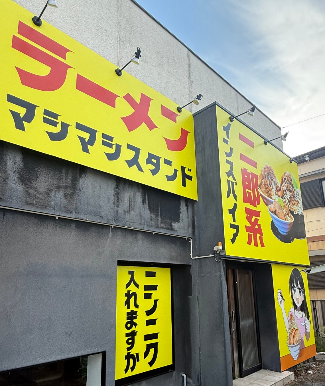 マシマシスタンド一宮店は、大きな黄色の看板が目印。