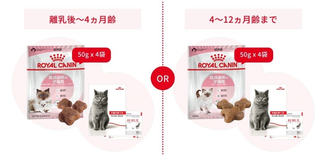 日本では6回目の実施となり、本年も子猫対象となります。子猫期の12ヵ月間に適切な栄養を与えることが、生涯にわたる健康の基盤をつくる上で重要であることを子猫オーナーの皆様に知っていただくと共に、子猫の健やかな成長を応援するため、月齢に合わせて選べる子猫専用のフードサンプルを3日間お試しいただけるキャンペーンとなります。