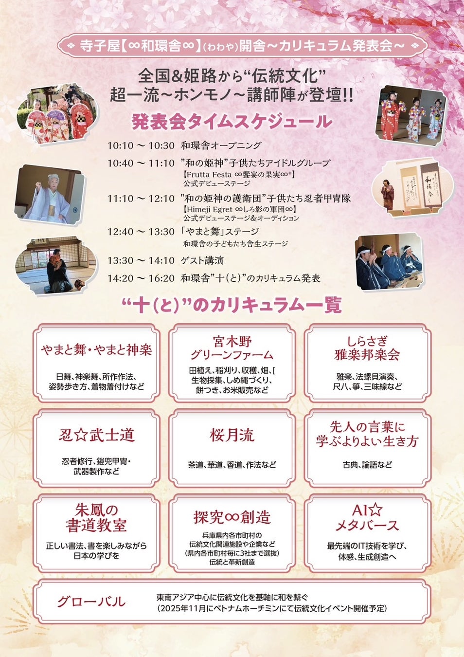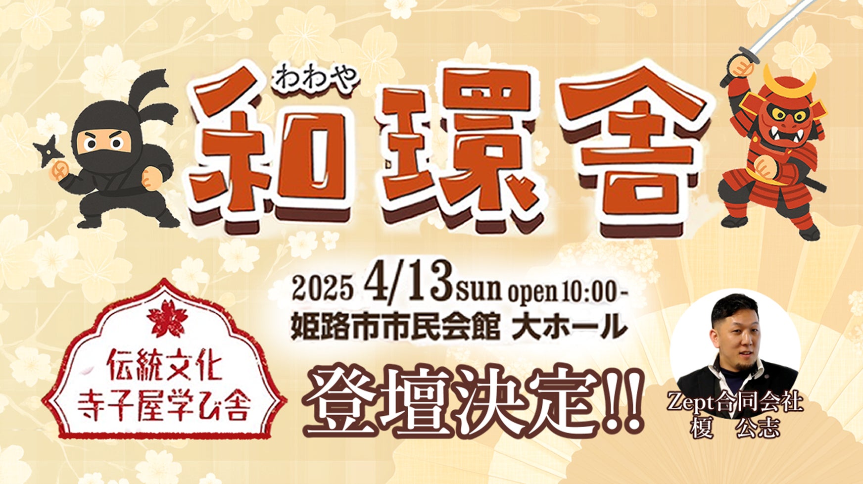 Zept合同会社(本社:兵庫県姫路市、代表社員:榎公志)は、2025年4月13日(日)に姫路市市民会館 大ホールで開催される伝統文化イベント、寺子屋「∞和環舎∞」(わわや)にて、代表の榎公志が登壇することをお知らせいたします。