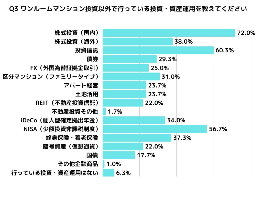 ワンルームマンション投資以外で行っている投資・資産運用を聞いたところ、国内株式72%(216人)、投資信託60.3%(181人)、NISA56.7%(170人)が上位となりました。