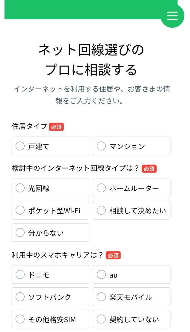 入力はすべて選択式で、複雑な専門用語や料金プランを理解していない、光回線・ホームルーターなどの区別が分からない場合でも問題ありません。