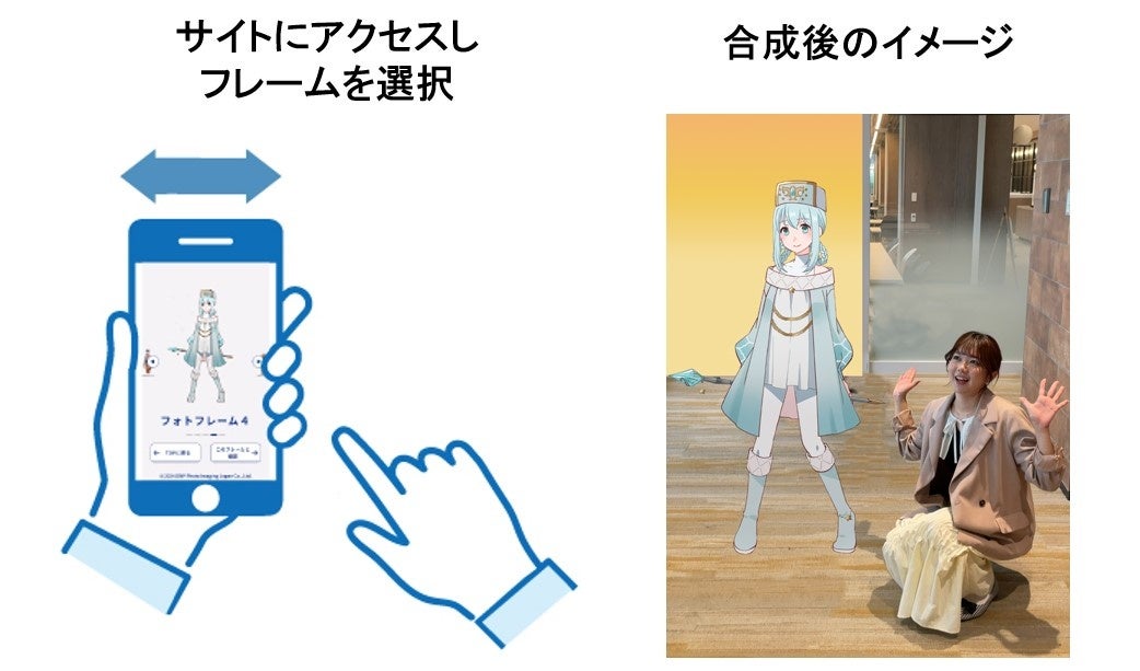 AR(Augmented Reality:拡張現実)技術を使って、スマートフォンのWebブラウザ上で実際の背景とキャラクター画像などを組み合わせて撮影します。まるでキャラクターが目の前にいるかのような撮影が体験できます。