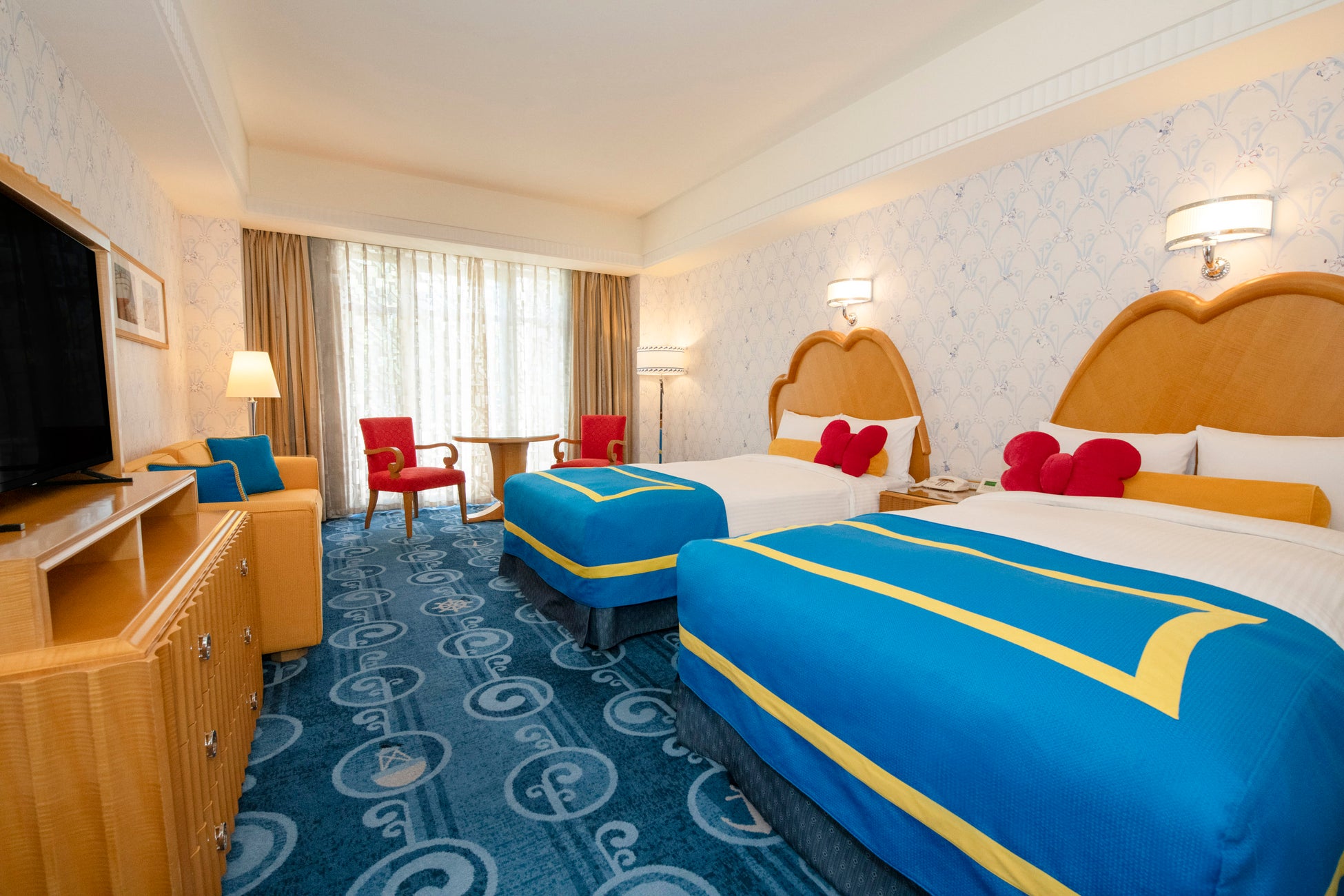 ドナルドダックの衣装であるセーラー服の青や黄色、赤を基調にした明るい客室です。カーペットをはじめ、壁紙やベッドスローなど、いたるところにドナルドらしい装飾を施しています。