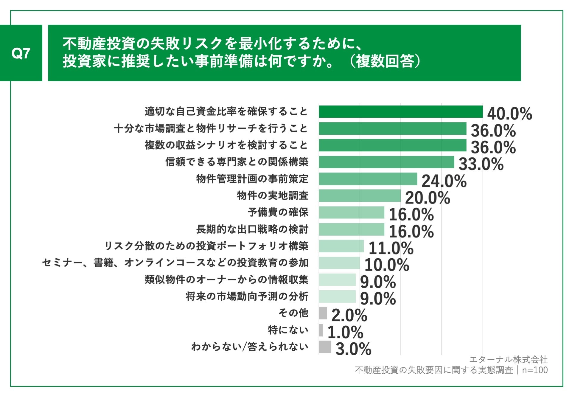 「Q7.不動産投資の失敗リスクを最小化するために、投資家に推奨したい事前準備は何ですか。(複数回答)」(n=100)と質問したところ、「適切な自己資金比率を確保すること」が40.0%、「十分な市場調査と物件リサーチを行うこと」が36.0%、「複数の収益シナリオを検討すること」が36.0%という回答となりました。