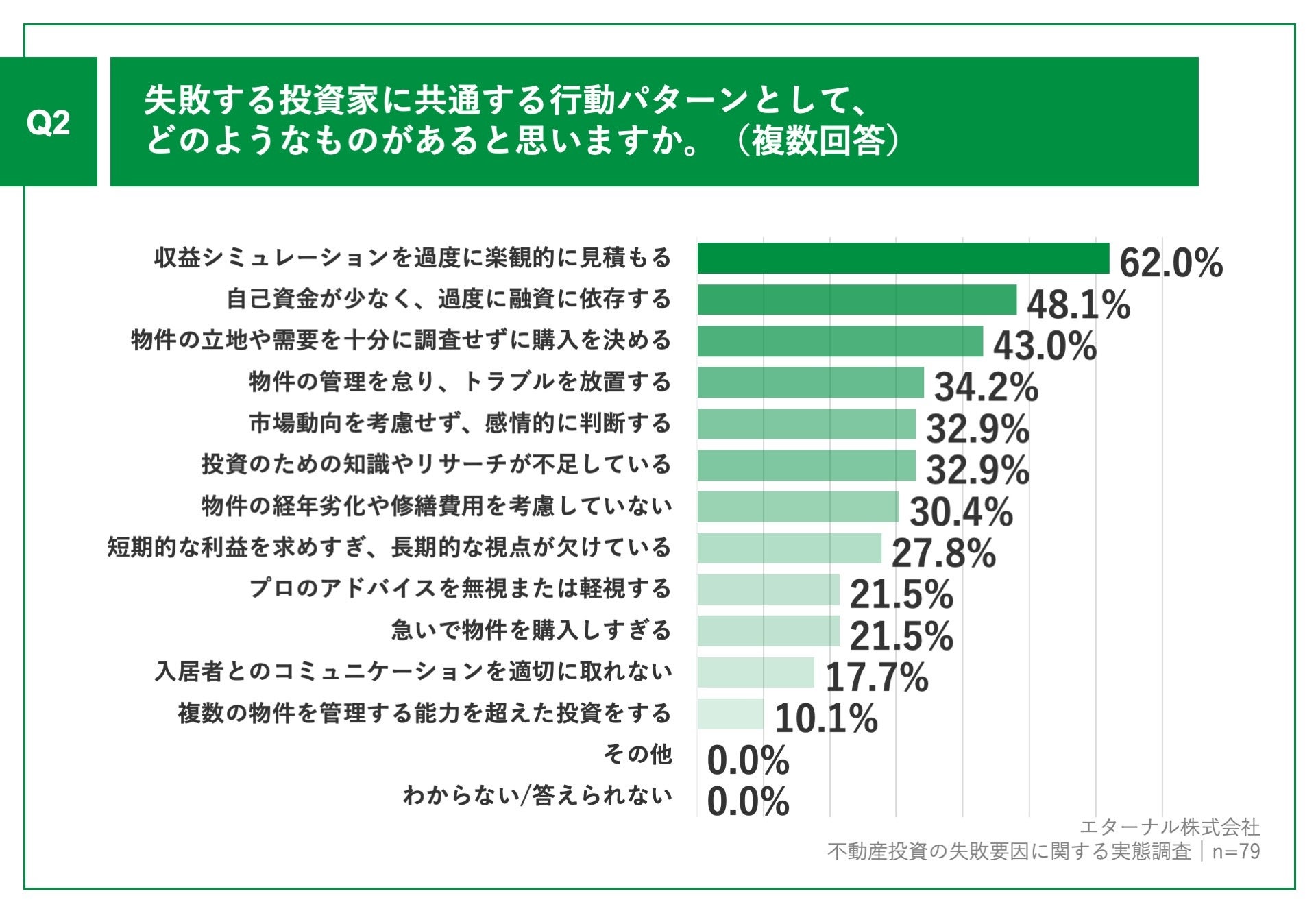 Q1で「非常にそう思う」「ややそう思う」と回答した方に、「Q2.失敗する投資家に共通する行動パターンとして、どのようなものがあると思いますか。(複数回答)」(n=79)と質問したところ、「収益シミュレーションを過度に楽観的に見積もる」が62.0%、「自己資金が少なく、過度に融資に依存する」が48.1%、「物件の立地や需要を十分に調査せずに購入を決める」が43.0%という回答となりました。