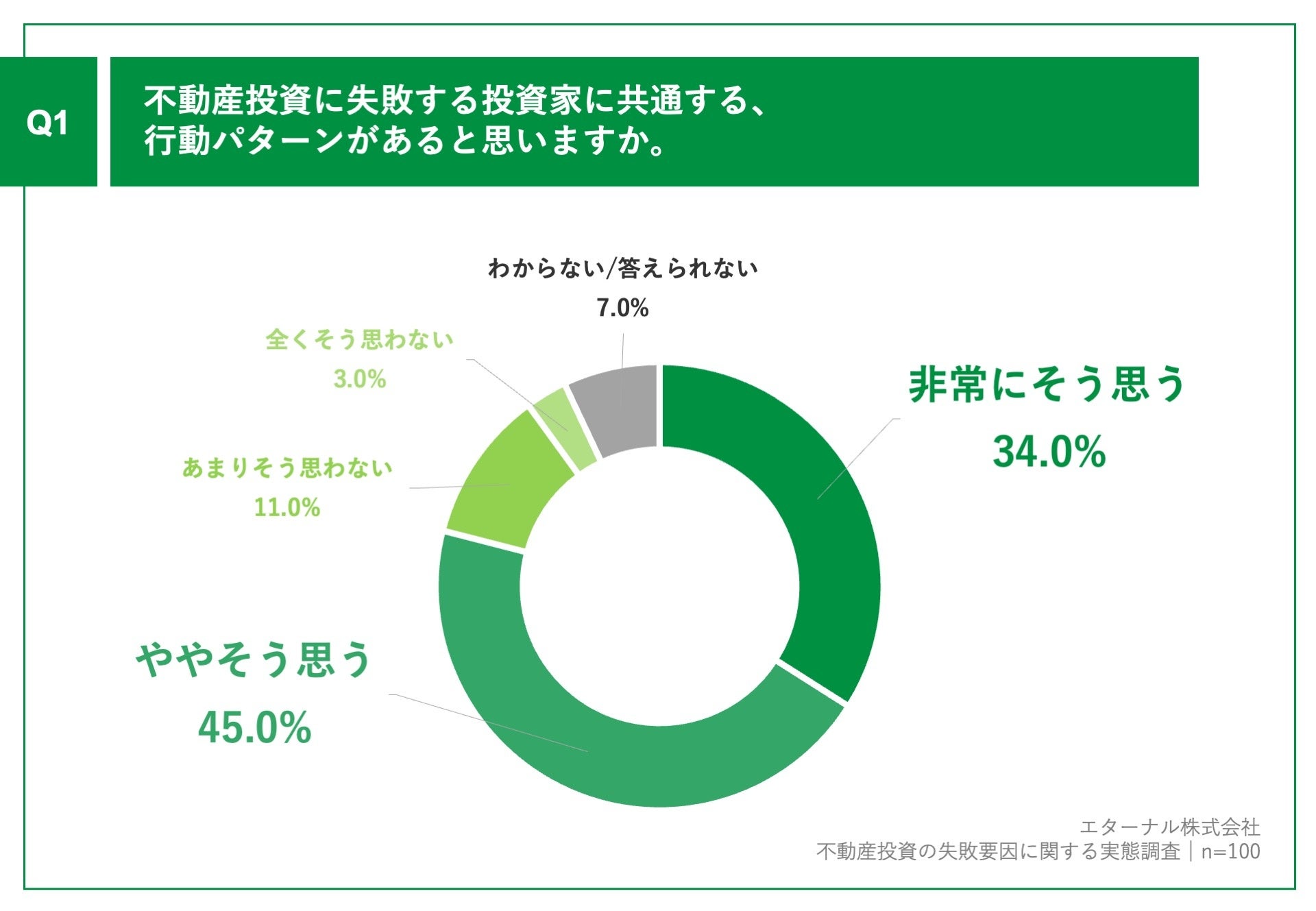 「Q1.不動産投資に失敗する投資家に共通する、行動パターンがあると思いますか。」(n=100)と質問したところ、「非常にそう思う」が34.0%、「ややそう思う」が45.0%という回答となりました。