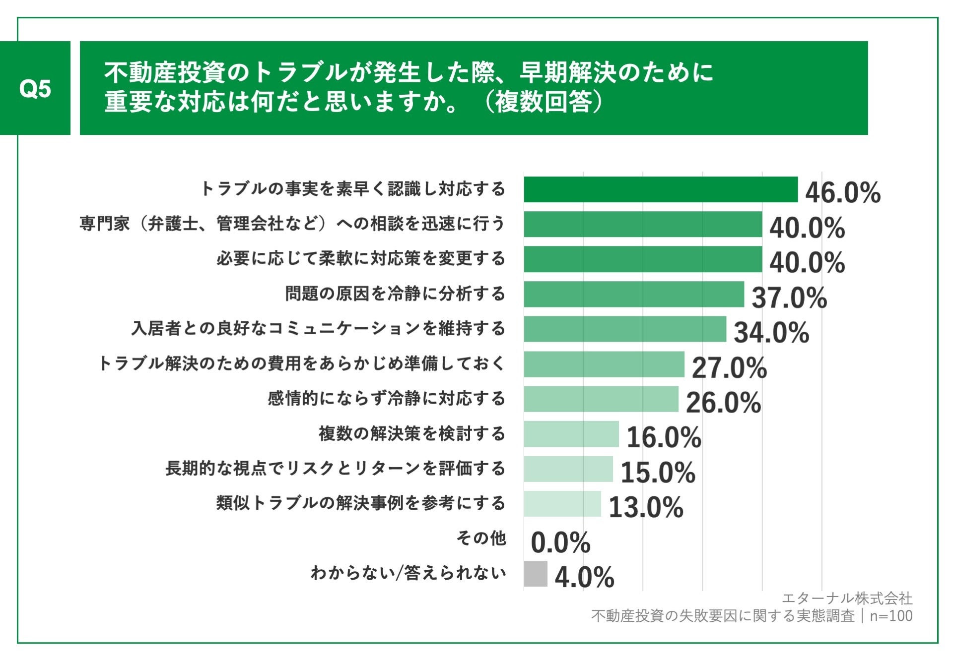 「Q5.不動産投資のトラブルが発生した際、早期解決のために重要な対応は何だと思いますか。(複数回答)」(n=100)と質問したところ、「トラブルの事実を素早く認識し対応する」が46.0%、「専門家(弁護士、管理会社など)への相談を迅速に行う」が40.0%、「必要に応じて柔軟に対応策を変更する」が40.0%という回答となりました。