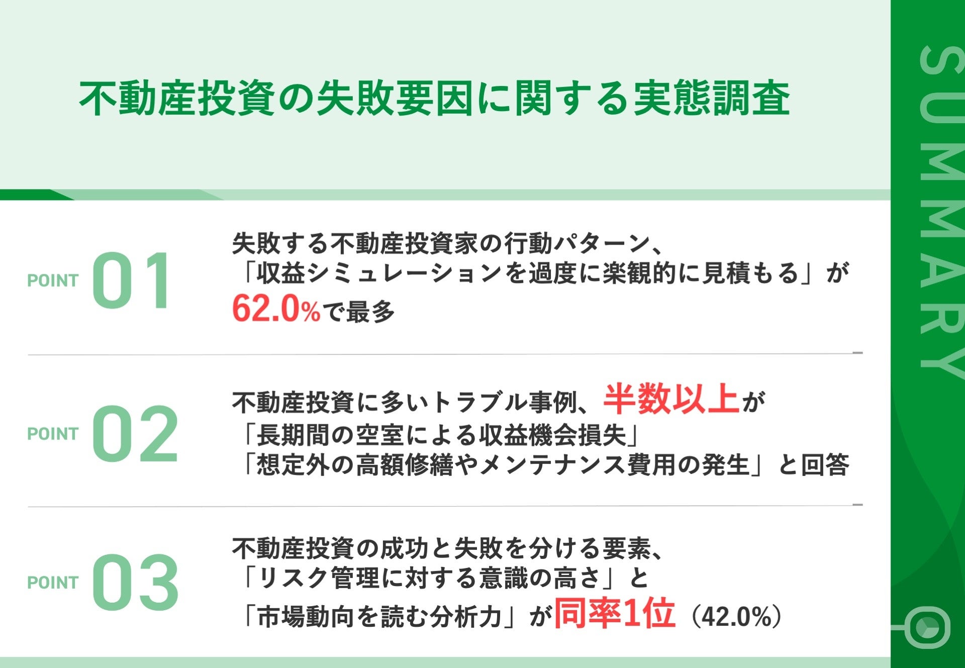 不動産投資の失敗要因に関する実態調査を実施しましたので、お知らせいたします。