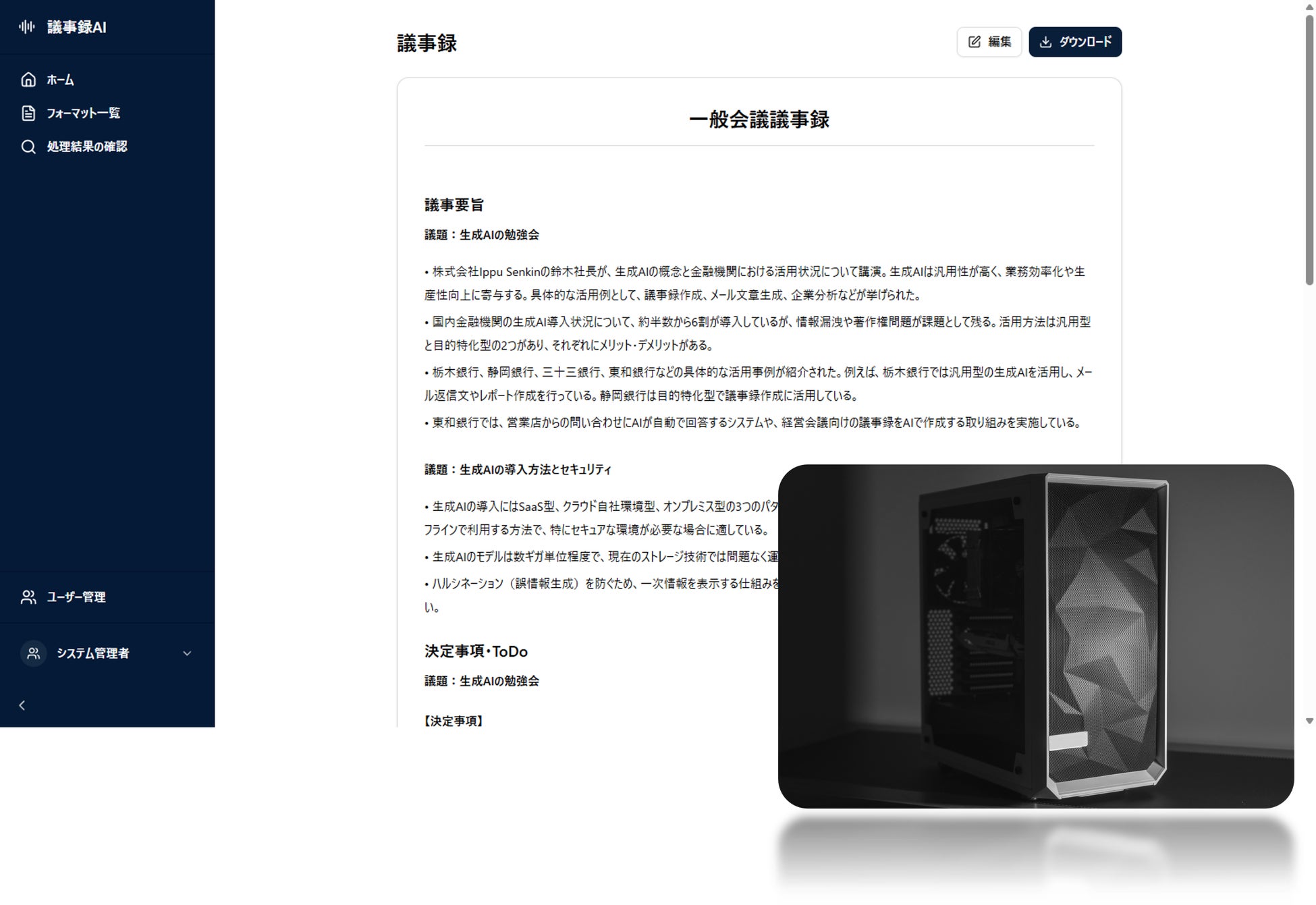 今回提供開始する「生成AI議事録ソリューション」は、これらの課題を根本から解決する完全オンプレミス型のシステムです。Ippu SenkinがAI議事録専用の超高性能PCを提供し、お客様の社内ネットワークに接続することで、ユーザーは業務端末から議事録アプリケーションにアクセスし、音声ファイルを添付するだけで高性能生成AIが議事録を生成します。