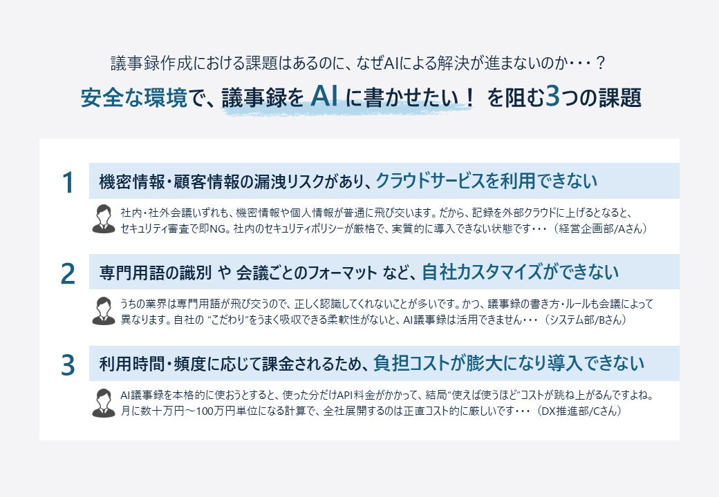 また、既存のクラウド型AI議事録サービスには、企業が直面する以下の課題が存在しています。