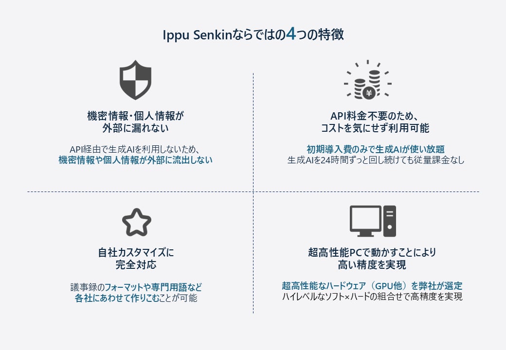 株式会社Ippu Senkin(本社:東京都中央区、代表取締役CEO:鈴木 秀弥、以下「Ippu Senkin」)は、完全オンプレミス型の生成AI議事録ソリューションを本日より本格提供開始いたします。