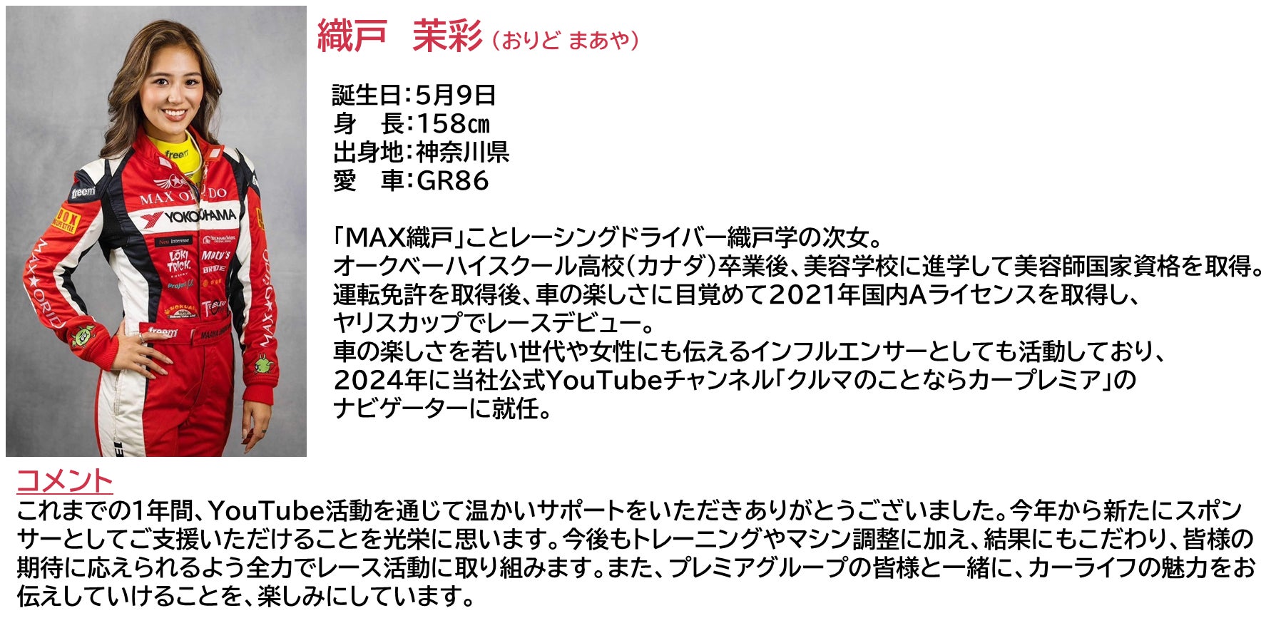 プレミアグループ、女性レーシングドライバー織戸茉彩選手とスポンサー契約を締結