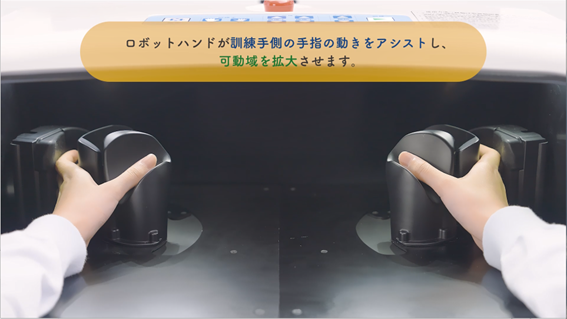 「リーダフォロワ方式」を採用し、正常手※側のロボットハンド(リーダ)を動かすことで訓練手側のロボットハンド(フォロワ)が同じ動きを再現し、手指の動きをアシスト。また画面上に正常手側の動作映像の反転画像が表示されます。