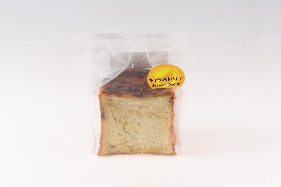 内容: バナナの風味豊かなデニッシュの中にキャラメルチョコを散りばめました。バナナとキャラメルの2つの甘さがマッチしたデニッシュです。