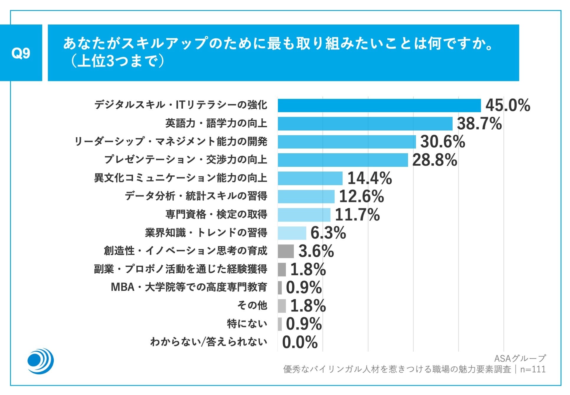 「Q9.あなたがスキルアップのために最も取り組みたいことは何ですか。(上位3つまで)」(n=111)と質問したところ、「デジタルスキル・ITリテラシーの強化」が45.0%、「英語力・語学力の向上」が38.7%、「リーダーシップ・マネジメント能力の開発」が30.6%という回答となりました。