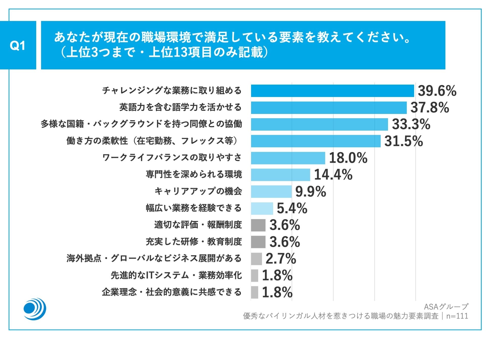 「Q1.あなたが現在の職場環境で満足している要素を教えてください。(上位3つまで)」(n=111)と質問したところ、「チャレンジングな業務に取り組める」が39.6%、「英語力を含む語学力を活かせる」が37.8%、「多様な国籍・バックグラウンドを持つ同僚との協働」が33.3%という回答となりました。