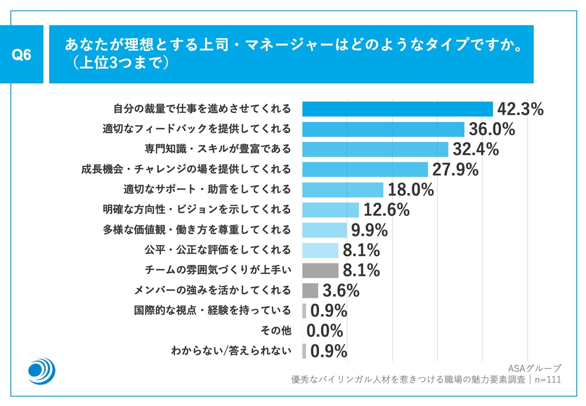 「Q6.あなたが理想とする上司・マネージャーはどのようなタイプですか。(上位3つまで)」(n=111)と質問したところ、「自分の裁量で仕事を進めさせてくれる」が42.3%、「適切なフィードバックを提供してくれる」が36.0%、「専門知識・スキルが豊富である」が32.4%という回答となりました。
