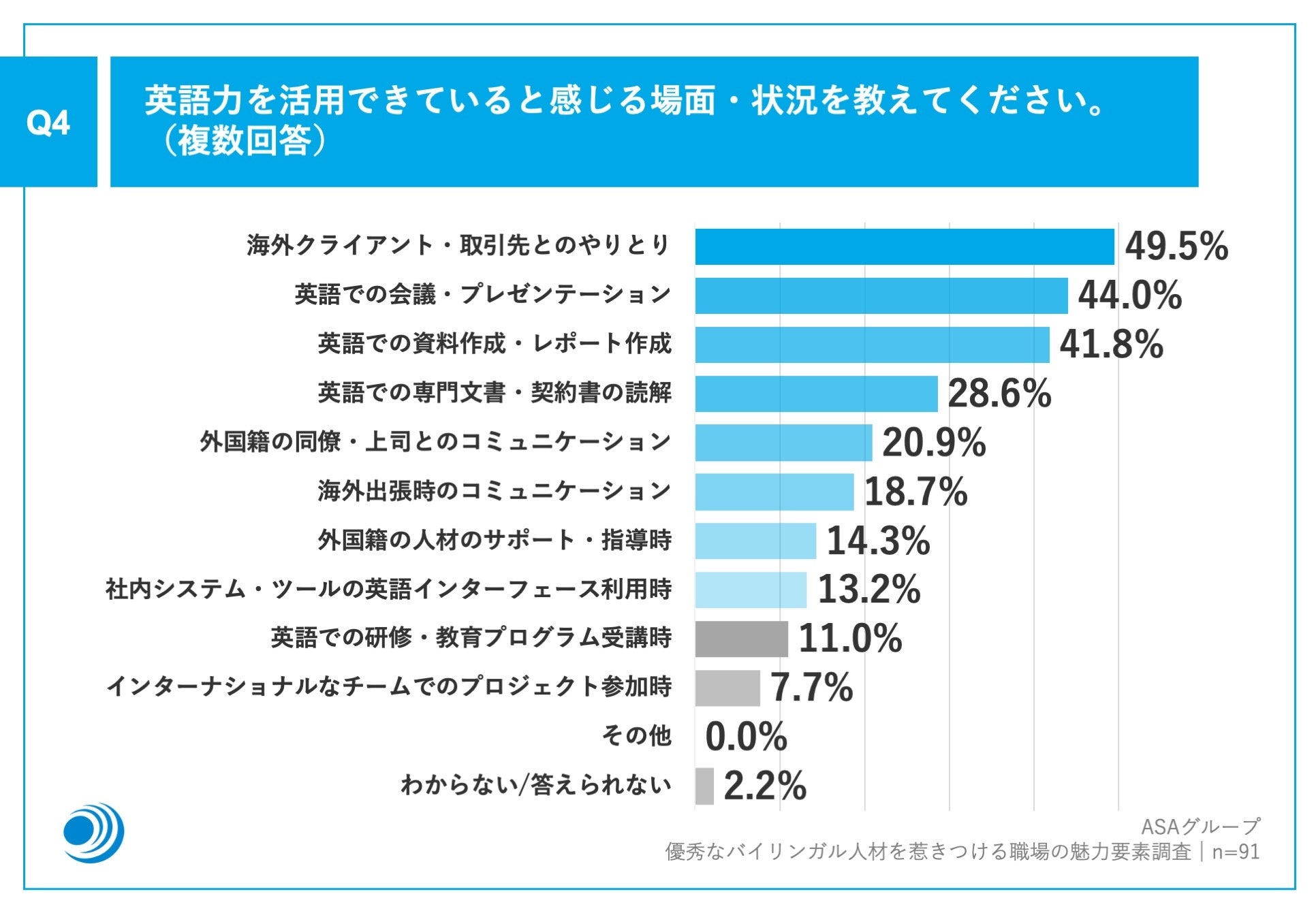 Q3で「非常に活用できている」「ある程度活用できている」と回答した方に、「Q4.英語力を活用できていると感じる場面・状況を教えてください。(複数回答)」(n=91)と質問したところ、「海外クライアント・取引先とのやりとり」が49.5%、「英語での会議・プレゼンテーション」が44.0%、「英語での資料作成・レポート作成」が41.8%という回答となりました。