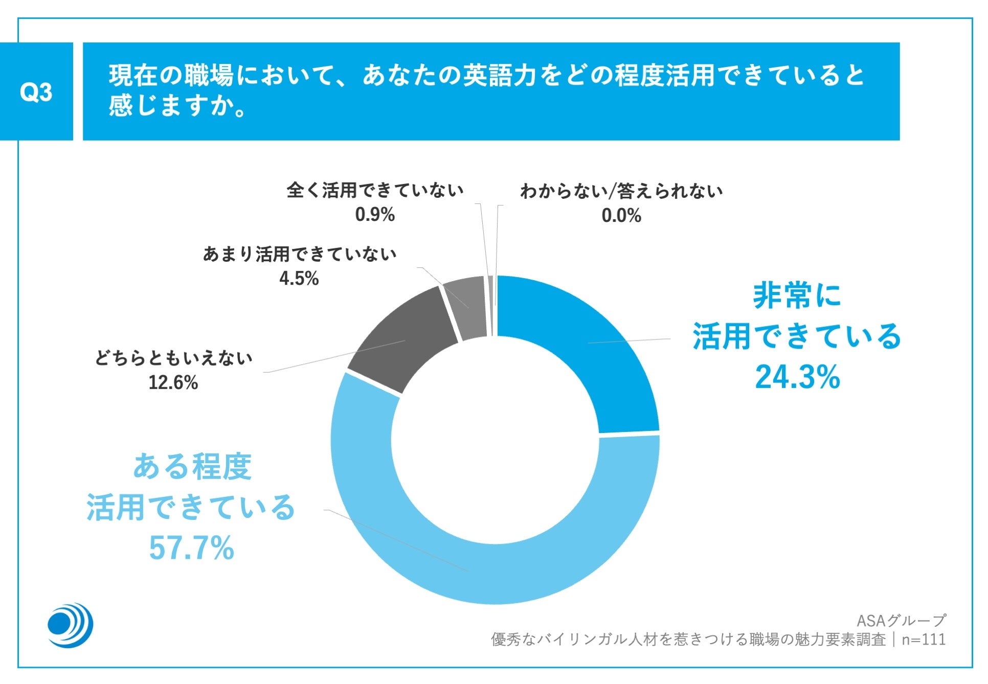 「Q3.現在の職場において、あなたの英語力をどの程度活用できていると感じますか。」(n=111)と質問したところ、「非常に活用できている」が24.3%、「ある程度活用できている」が57.7%という回答となりました。