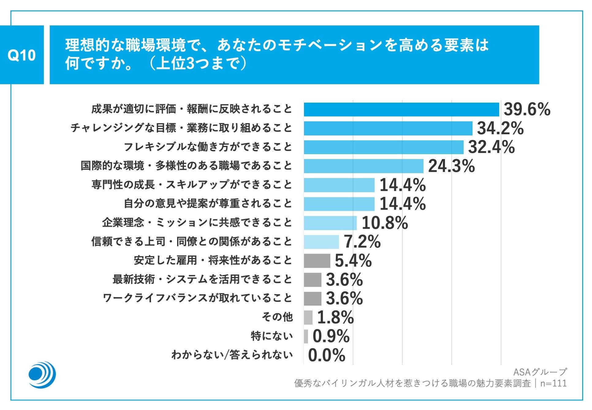 ASAグループ(本社:東京都港区、グループ代表:松澤 和浩、粟国 正樹)は、現在の職場環境に満足しており、継続して勤務したいと考えている、25歳〜39歳の日英バイリンガル人材(TOEIC 800点相当以上かつ、英語で流暢にビジネスコミュニケーションができる)111名を対象に、優秀なバイリンガル人材を惹きつける職場の魅力要素調査を実施しましたので、お知らせいたします。