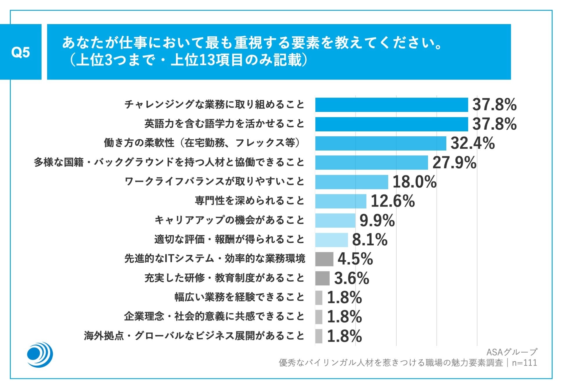 「Q5.あなたが仕事において最も重視する要素を教えてください。(上位3つまで)」(n=111)と質問したところ、「チャレンジングな業務に取り組めること」が37.8%、「英語力を含む語学力を活かせること」が37.8%、「働き方の柔軟性(在宅勤務、フレックス等)」が32.4%という回答となりました。