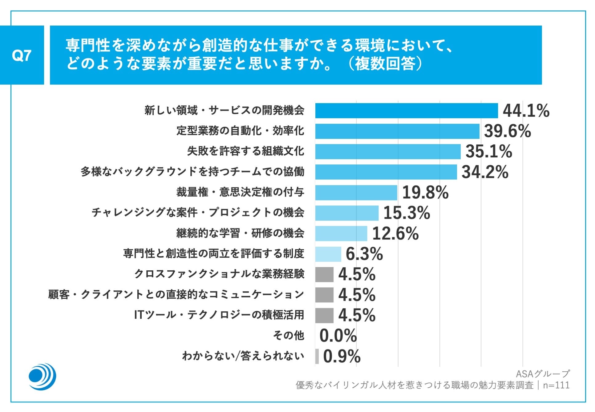 「Q7.専門性を深めながら創造的な仕事ができる環境において、どのような要素が重要だと思いますか。(複数回答)」(n=111)と質問したところ、「新しい領域・サービスの開発機会」が44.1%、「定型業務の自動化・効率化」が39.6%、「失敗を許容する組織文化」が35.1%という回答となりました。