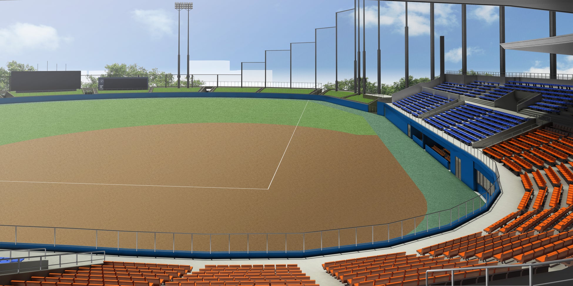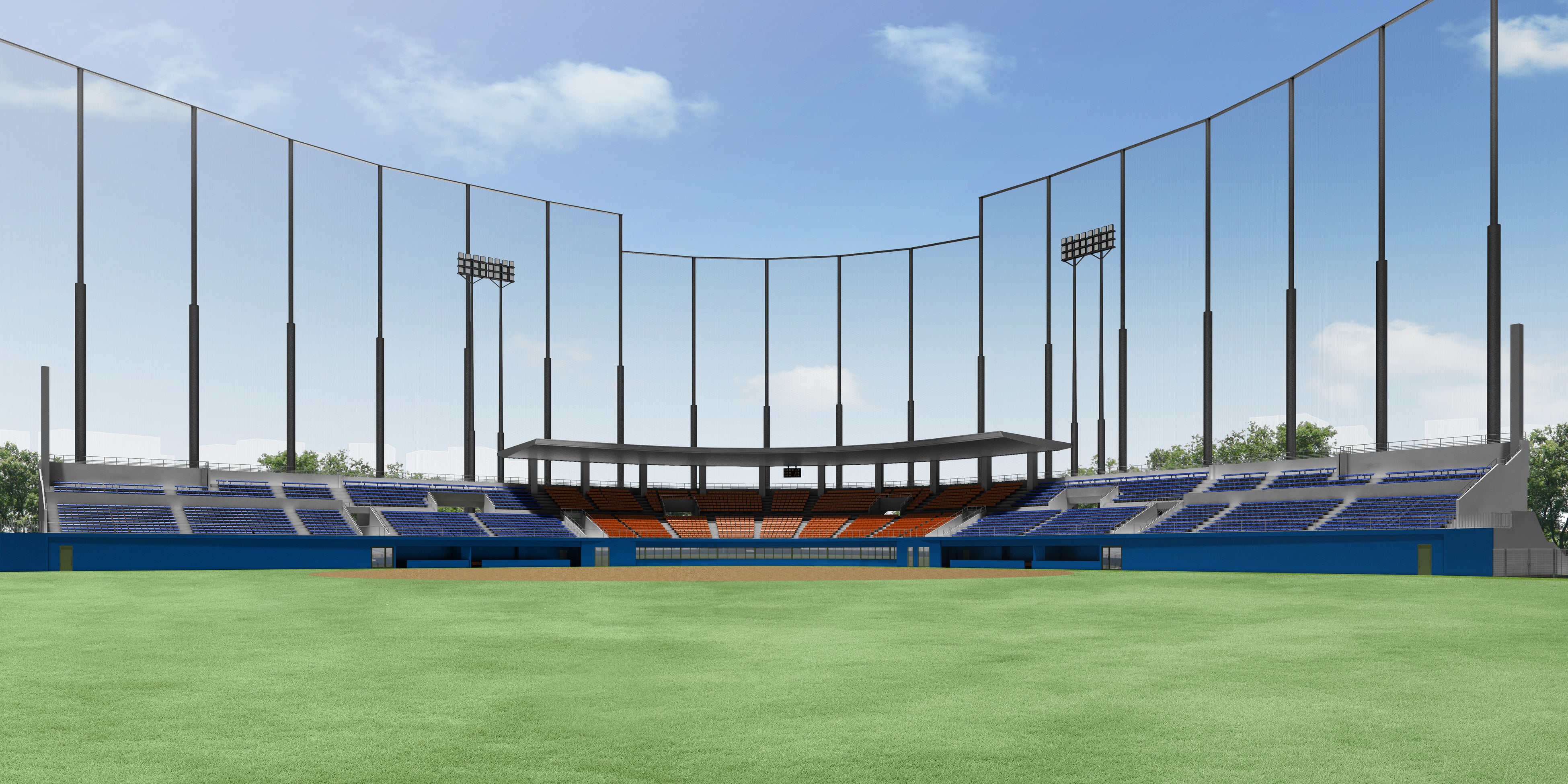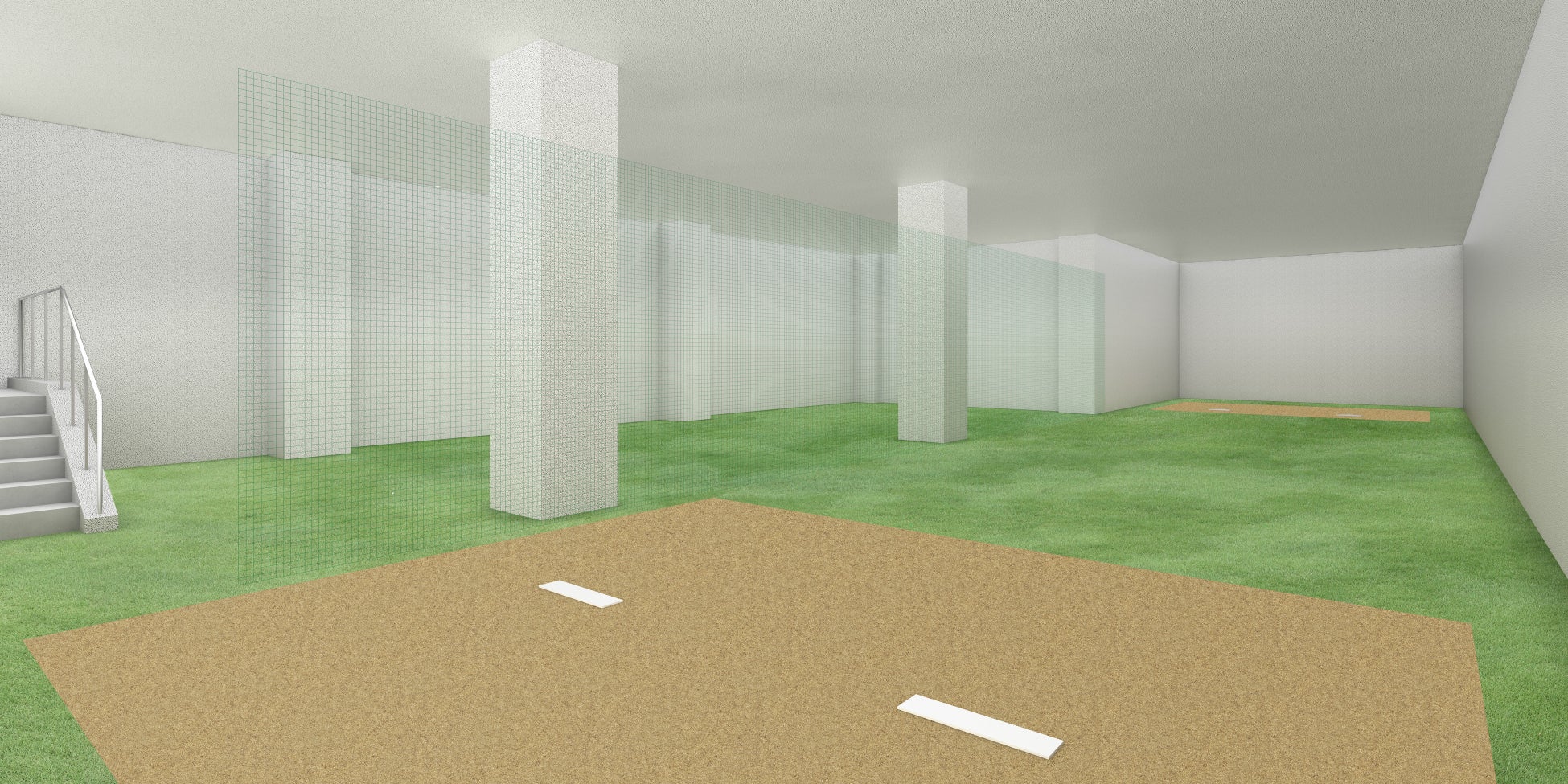 屋内ブルペン 屋内ウォーミングアップ場 LEDナイター照明塔6基、LED電光スコアボード 防球ネット |