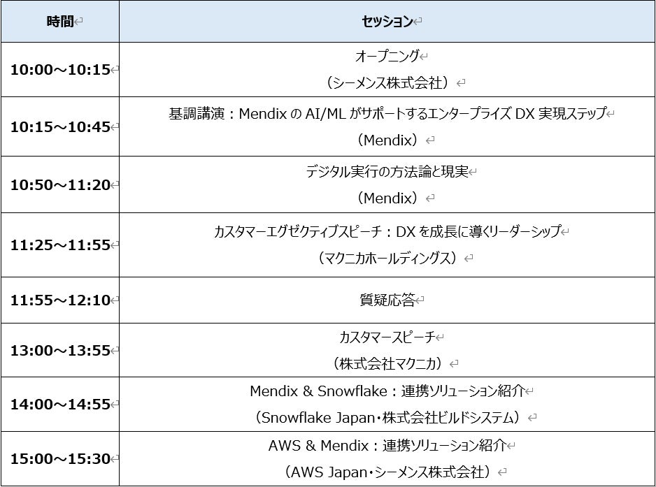 本イベントでは、現在、ローコード開発が企業のデジタルトランスフォーメーションにどのように貢献しているかを説明するとともに、SnowflakeやAWSといったテクノロジーパートナーとMendixの提携によって提供している最新のソリューションを紹介します。また、AIによる業務改革やMx AppFactoryを活用した効率的かつ大規模なアプリケーション開発のノウハウを解説します。