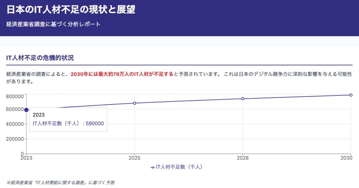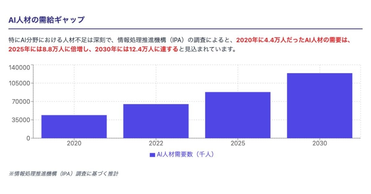 経済産業省「IT人材需給に関する調査」および情報処理推進機構(IPA)の調査によれば、AI人材の需要は2020年の4.4万人から2025年には8.8万人と倍増し、2030年には12.4万人に達する見込みです。一方、IT人材全体では2030年に最大で約79万人が不足すると予測されています。