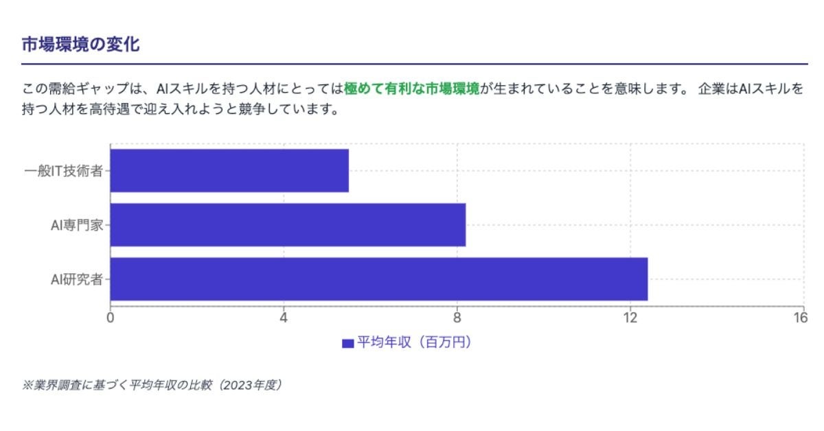 この深刻な需給ギャップが、AI人材の市場価値を急速に高めている背景です。即戦力となるAIスキルを持つ人材、特に具体的な成果物を示せる人材に対しては、企業側も破格の条件を提示してでも獲得したいと考えています。Aさんの事例は、適切な退職代行サービスの利用と、時代が求めるAIスキルの習得が、いかに劇的なキャリアアップと収入増につながるかを示しています。