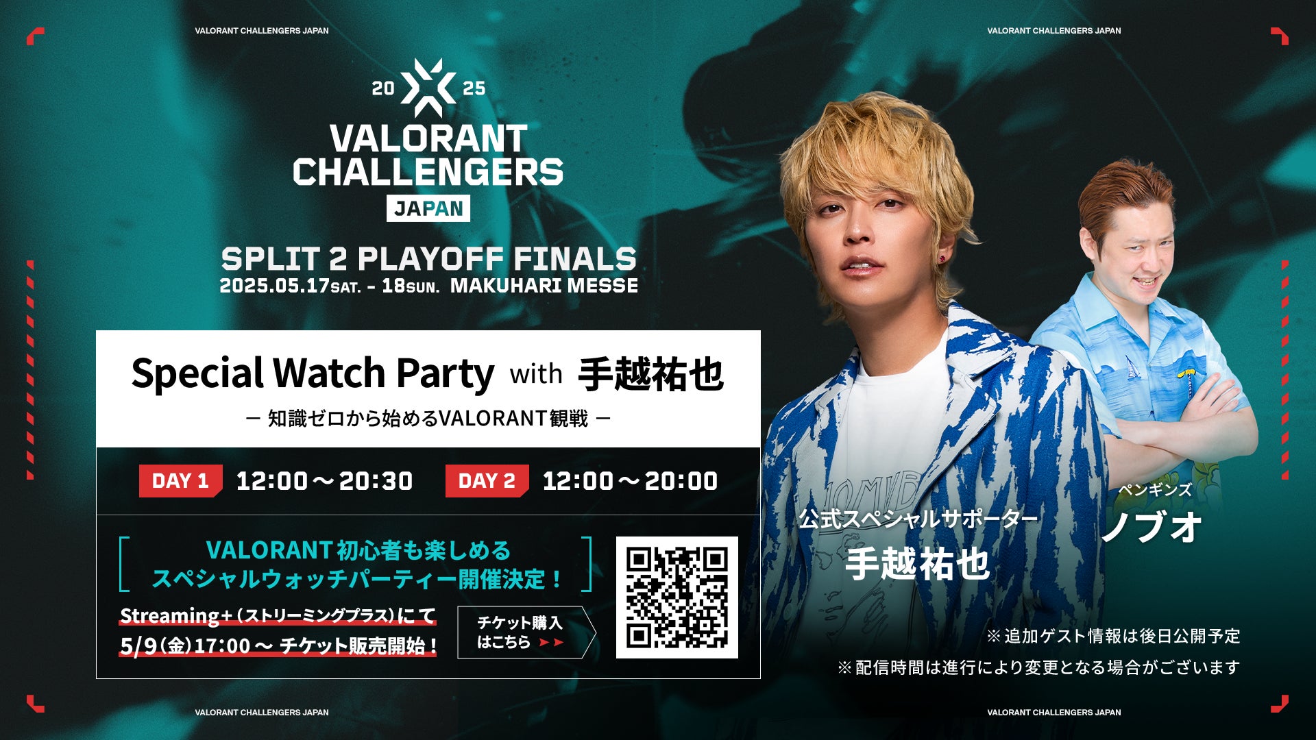 VALORANT Challengers Japan 2025実行委員会は、5月17日(土)、18日(日)に幕張メッセで開催する、ライアットゲームズが開発・運営するタクティカルFPSゲーム「VALORANT」の日本最大級のeスポーツ大会「VALORANT Challengers Japan 2025」のオフラインイベント「VALORANT Challengers Japan 2025 Split 2 Playoff Finals」にて、公式スペシャルサポーターの手越祐也さん、そして手越さんと一緒にYouTubeチャンネルでVALORANTをプレイしているペンギンズのノブオさんが出演する「Special Watch Party with 手越祐也」を開催いたします。そして、本イベントの配信チケットをイープラス(Streaming+)にて、5月9日(金)17:00より販売することが決定いたしました。
