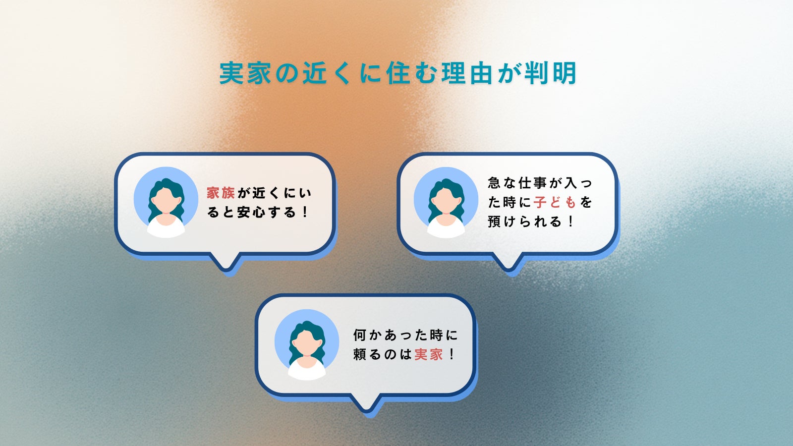 「はい」と回答した方の理由は、「生活上の安心感を得るため」「子どもの預け先として頼っている」「経済的に頼っている」と回答した人が9割を超え、悩みを軽減させるために実家の近くに住んでいることが分かりました。