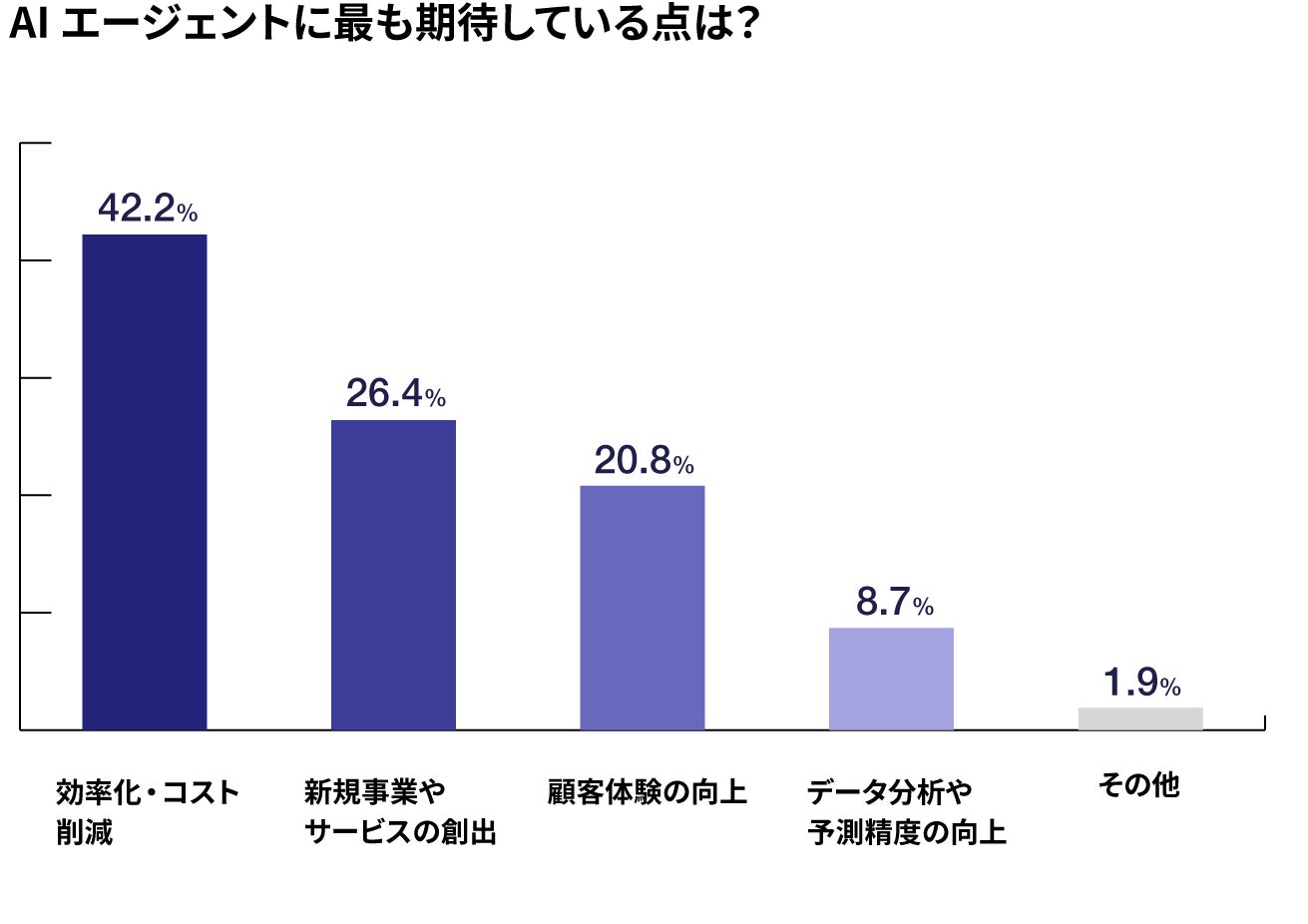 AIエージェントに対する期待として、「業務の効率化・コスト削減」「新規事業・サービスの創出」「顧客体験の向上」 の3つが特に高く、全体の約9割 を占める結果となりました。このことから、企業がAIエージェントを単なる自動化ツールではなく、新たなビジネスの可能性を生み出す戦略的な存在として捉えていることがわかりました。