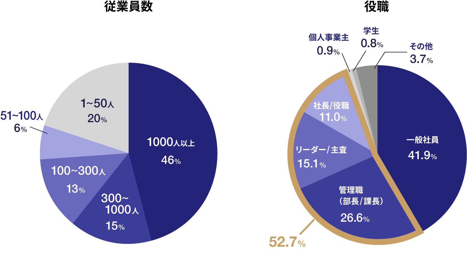 本イベントには、製造業・金融・コンサルティングなど幅広い業界からの参加があり、AIエージェントへの関心が業種を問わず広がっていることが明らかになりました。また、従業員1,000人規模の企業に所属する参加者が半数を占め、リーダー層や管理職、社長などの意思決定者が約半数を占めるなど、企業の戦略的な意思決定に関わる層からの高い関心がうかがえます。