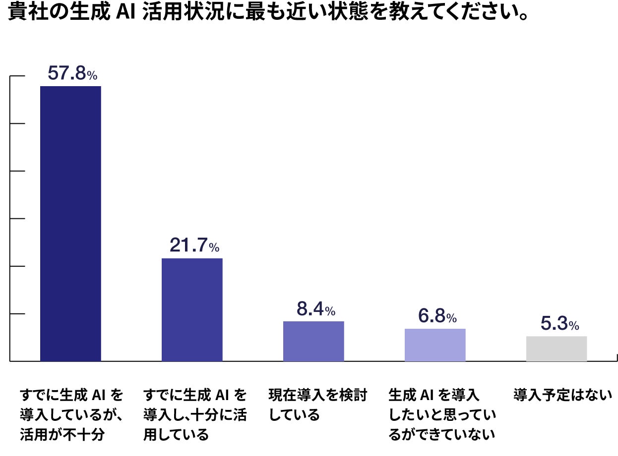 約6割の企業がすでに生成AIを導入済みである一方、多くの企業が「活用が不十分」と感じていることが判明しました。この結果は、生成AIのポテンシャルが十分に活かされていない現状を浮き彫りにしており、今後の活用推進が企業にとって重要な課題であることを示唆しています。
