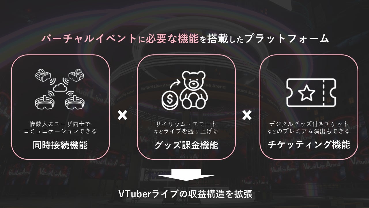 入場チケット、ツーショット機能、デジタルグッズ販売などを組み合わせた多層的な収益設計により、VTuberライブの収益構造を拡張します。