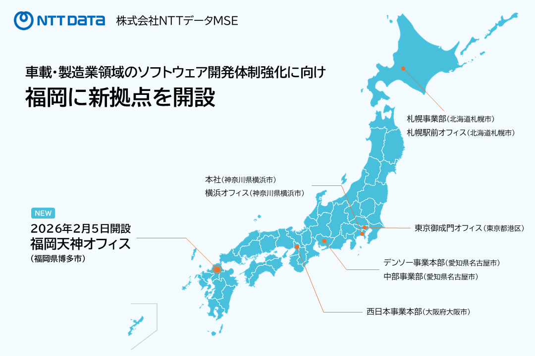 2026年2月、株式会社NTTデータMSE(本社:横浜市港北区、代表取締役社長:藤原 遠、以下、当社)は、車載を中心とした製造業領域のソフトウェア開発体制のさらなる強化を目的に、福岡に新たな拠点を開設しました。当社はこれまで、大阪・名古屋・札幌・御成門に拠点を展開し、地域に根ざした開発体制と、多様な人材が活躍できる環境づくりを進めています。今回、福岡での拠点開設により、九州地域のソフトウェア人材の活躍機会を創出するとともに、高度化・複雑化するソフトウェア開発ニーズに、より迅速かつ柔軟に対応します。
