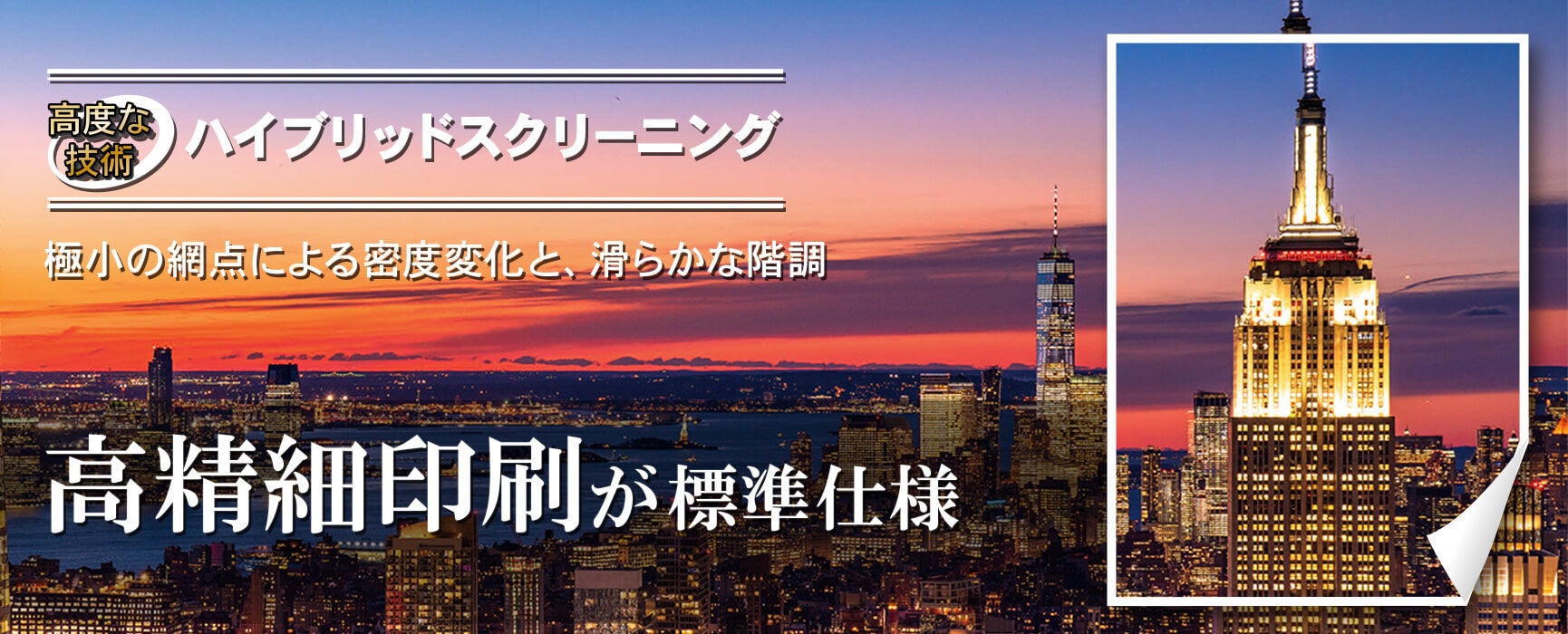 しかも、ウエーブなら追加料金なしで、一般的な商業印刷のレベルをはるかに超えるAM/FMハイブリッド700線相当の高精細なオフセット印刷を標準でお届け。さらに次のような特徴を備えている。