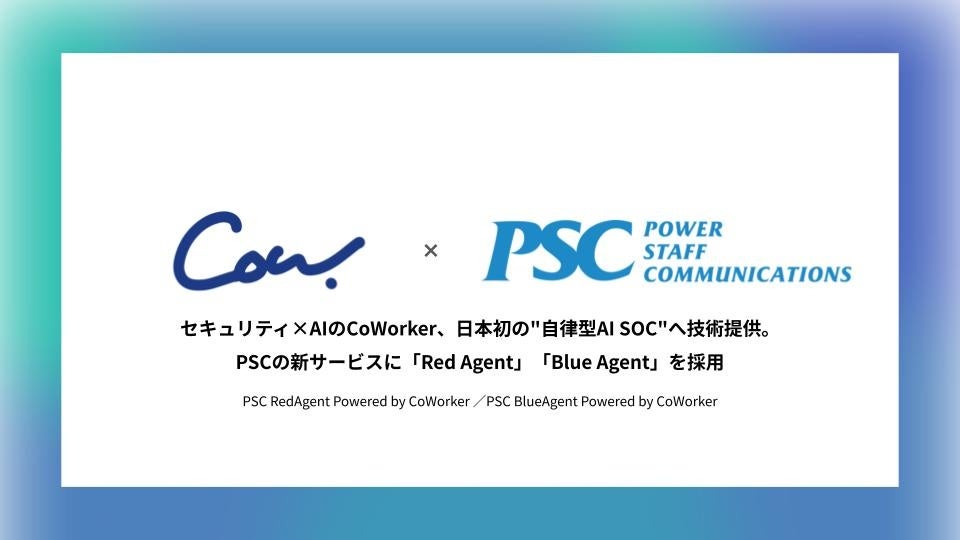 セキュリティ×AIソリューションを開発・提供するCoWorker株式会社(本社:東京都新宿区、代表取締役:山里一輝)は、自社開発のAIセキュリティソリューション「RedAgent」「BlueAgent」 が、株式会社ピーエスシー(本社:東京都港区、代表取締役:鈴木 正之、以下「PSC」)の新サービス「PSC AI SOCサービス」に採用されたことをお知らせします。