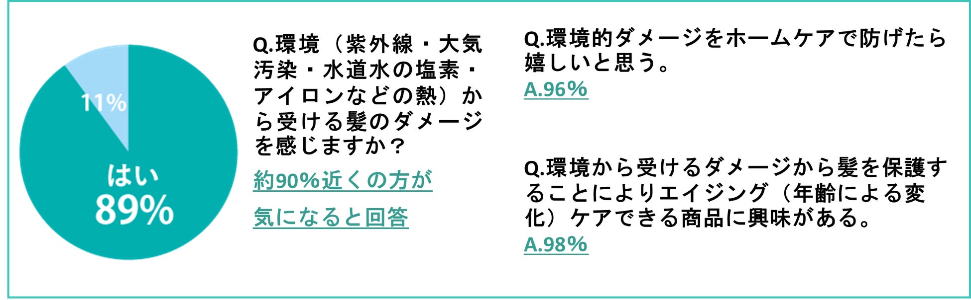 独自で一般消費者773名の方に「環境から受けるダメージを感じる事はありますか?」等のアンケートを行ったところ、約90%近くの方が「気になる」という回答でした。熱、紫外線、大気汚染、塩素などの日常に溢れる外的な刺激は髪や頭皮を老化させる原因にもなります。