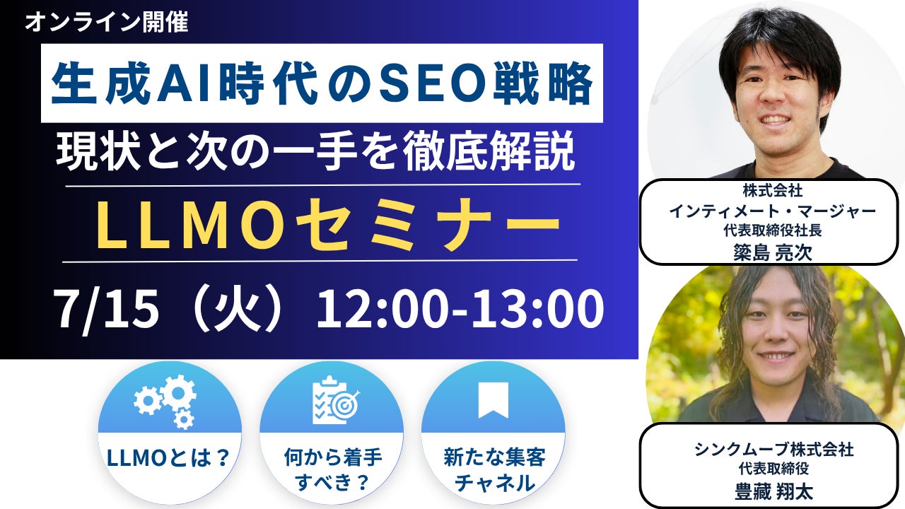 シンクムーブ株式会社は株式会社インティメート・マージャーと、2025年7月15日(火)12:00より、オンライン(Zoomウェビナー)にて「生成AI時代のSEO戦略:現状と次の一手を徹底解説」セミナーを開催いたします。