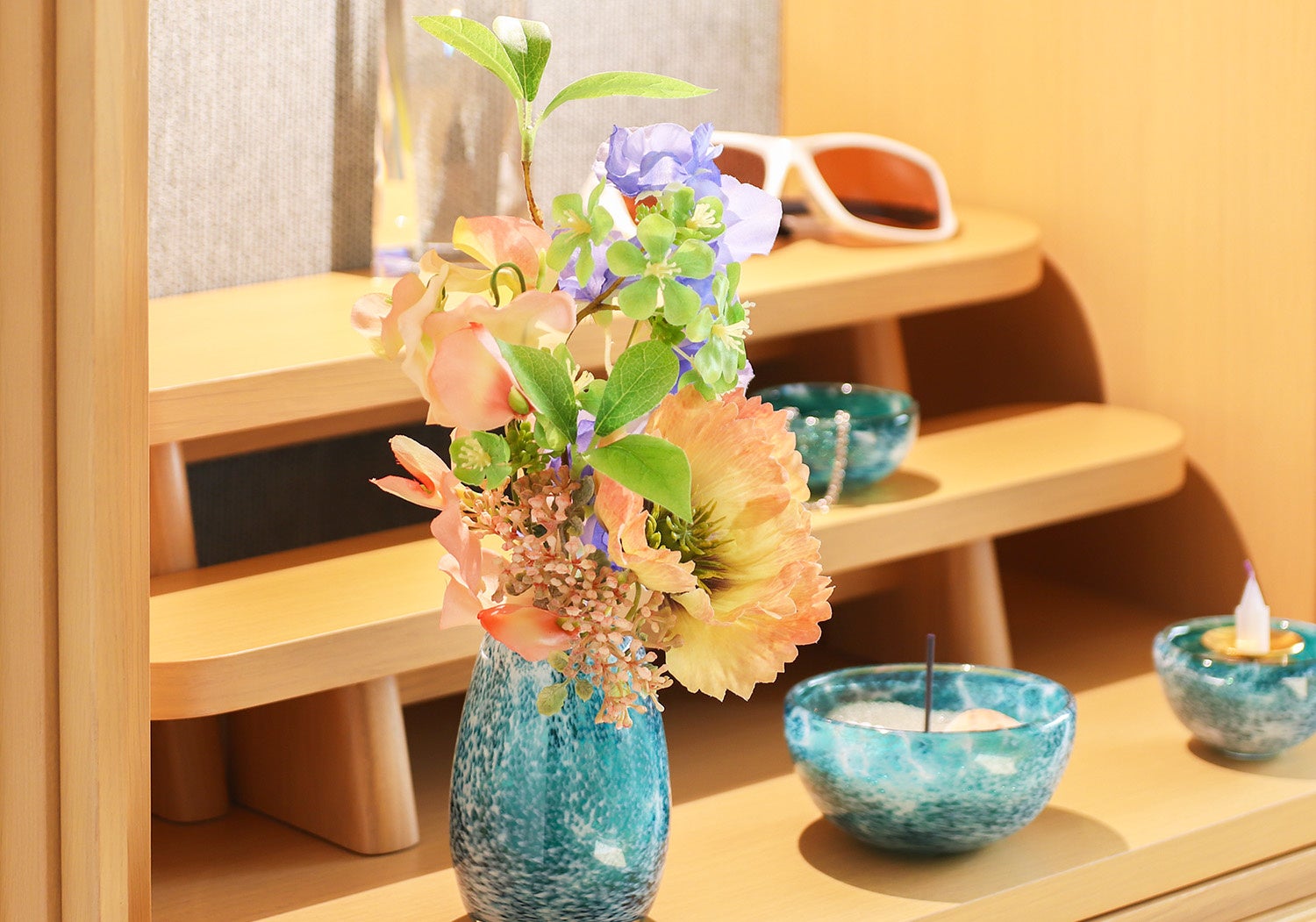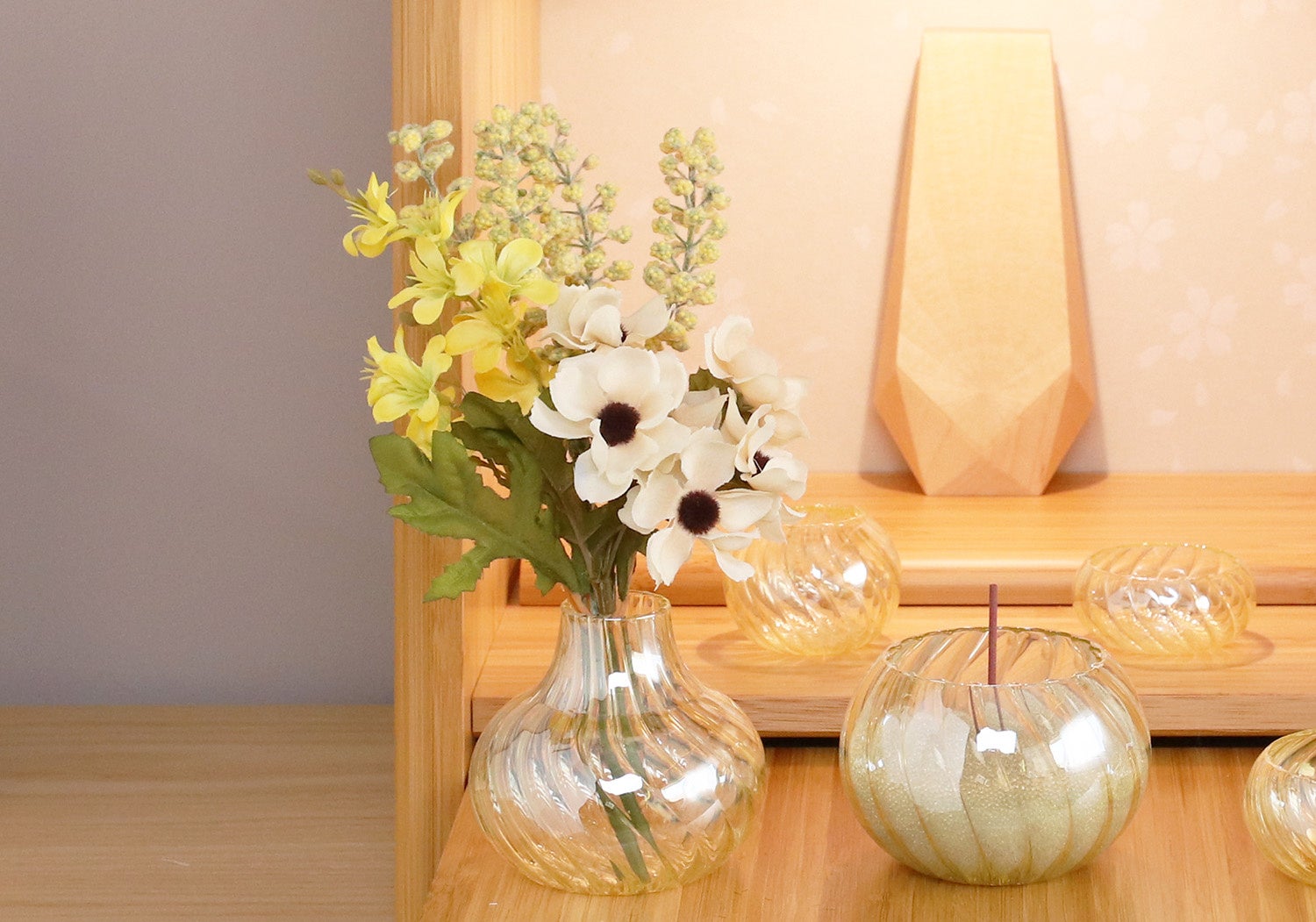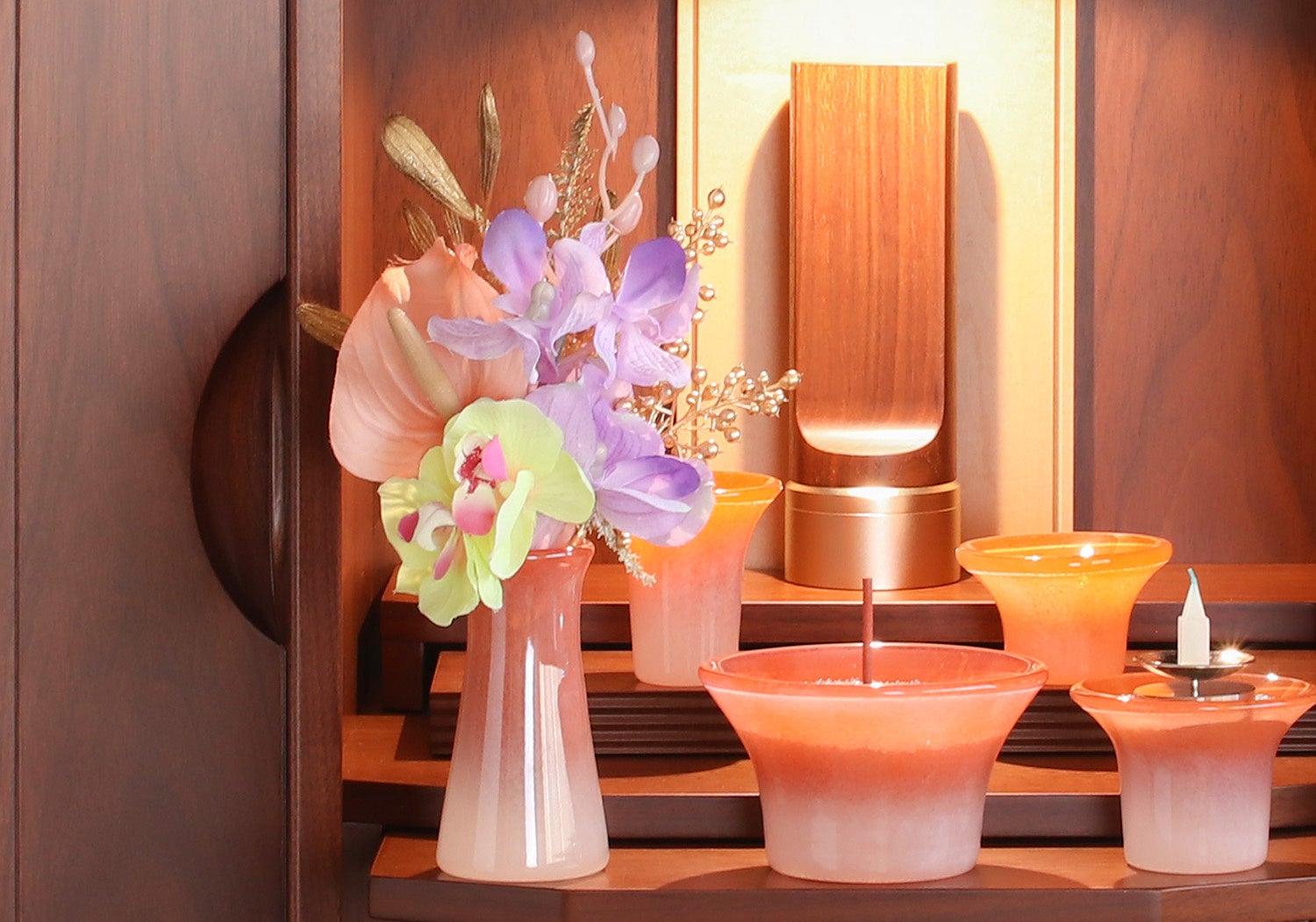 爽やかで夏らしい配色がまさに今の時期にぴったりなブーケです。シャーベットカラーのアンスリウムや、明るいゴールドの花材が軽やかで明るい印象を与えます。ツヤ感のあるガラス素材の仏具と合わせていただくと、より季節にマッチしたコーディネートに仕上がります。