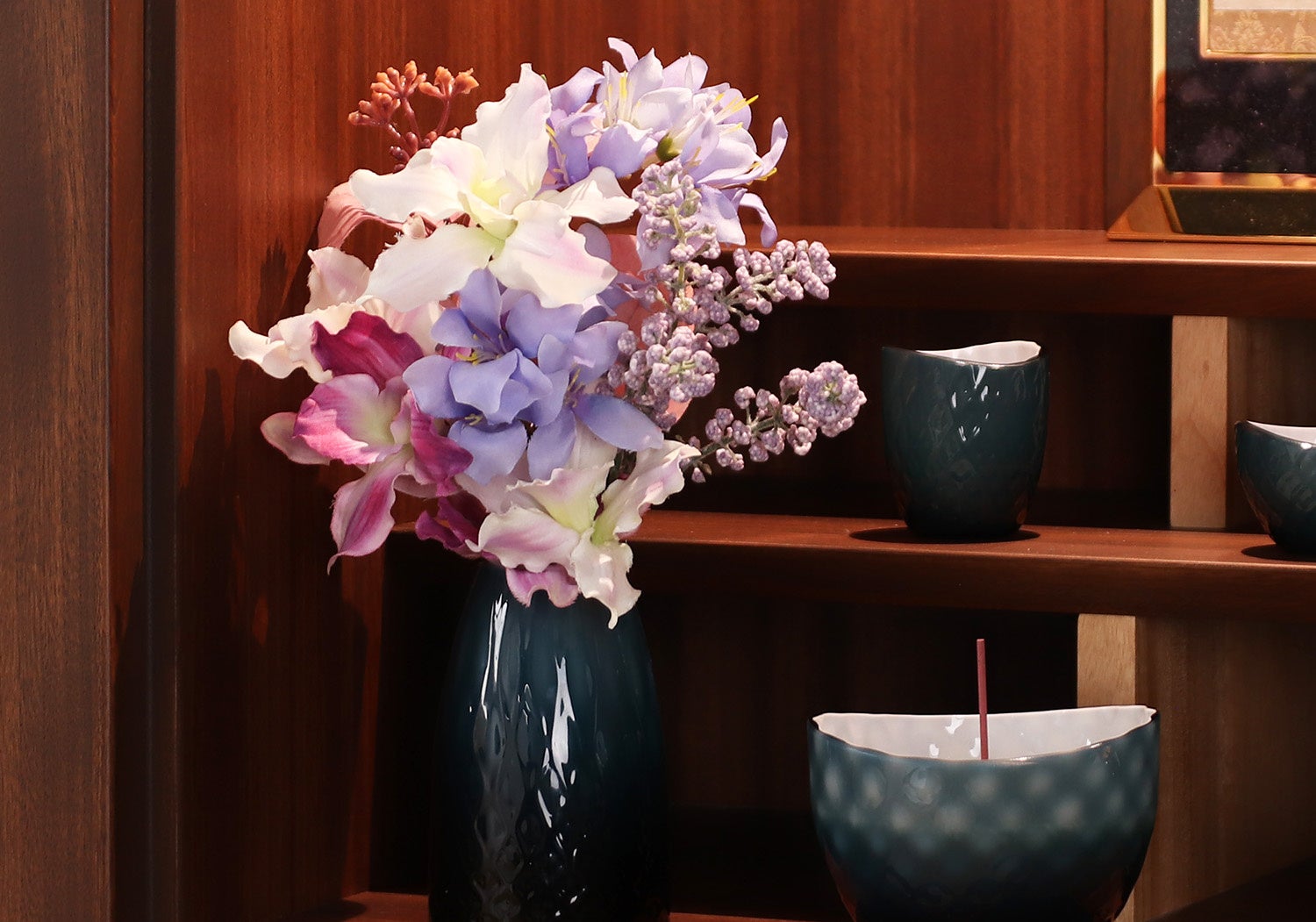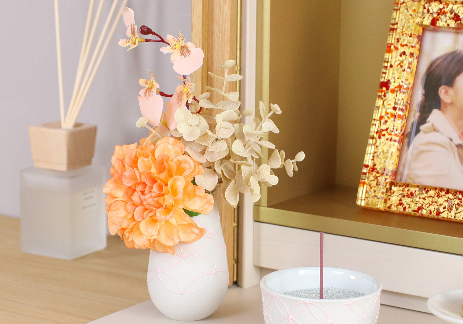 メモリアルフラワーとは、まるで生花のような質感と華やかさがありながら、水替えなどのお手入れが要らないお供え用のアーティシャルフラワーです。お供え花では珍しい、くすみピンクなどのトレンドカラーや、キラキラと光沢のある花材を取り入れ高いデザイン性を実現。モダンな仏壇になじみ祈りの空間を華やかに演出します。色の組み合わせや花材のバランスなど、細部にまでこだわりコーディネートしているため、自分でブーケを組む必要がなく花立に挿すだけで簡単にお供えできます。