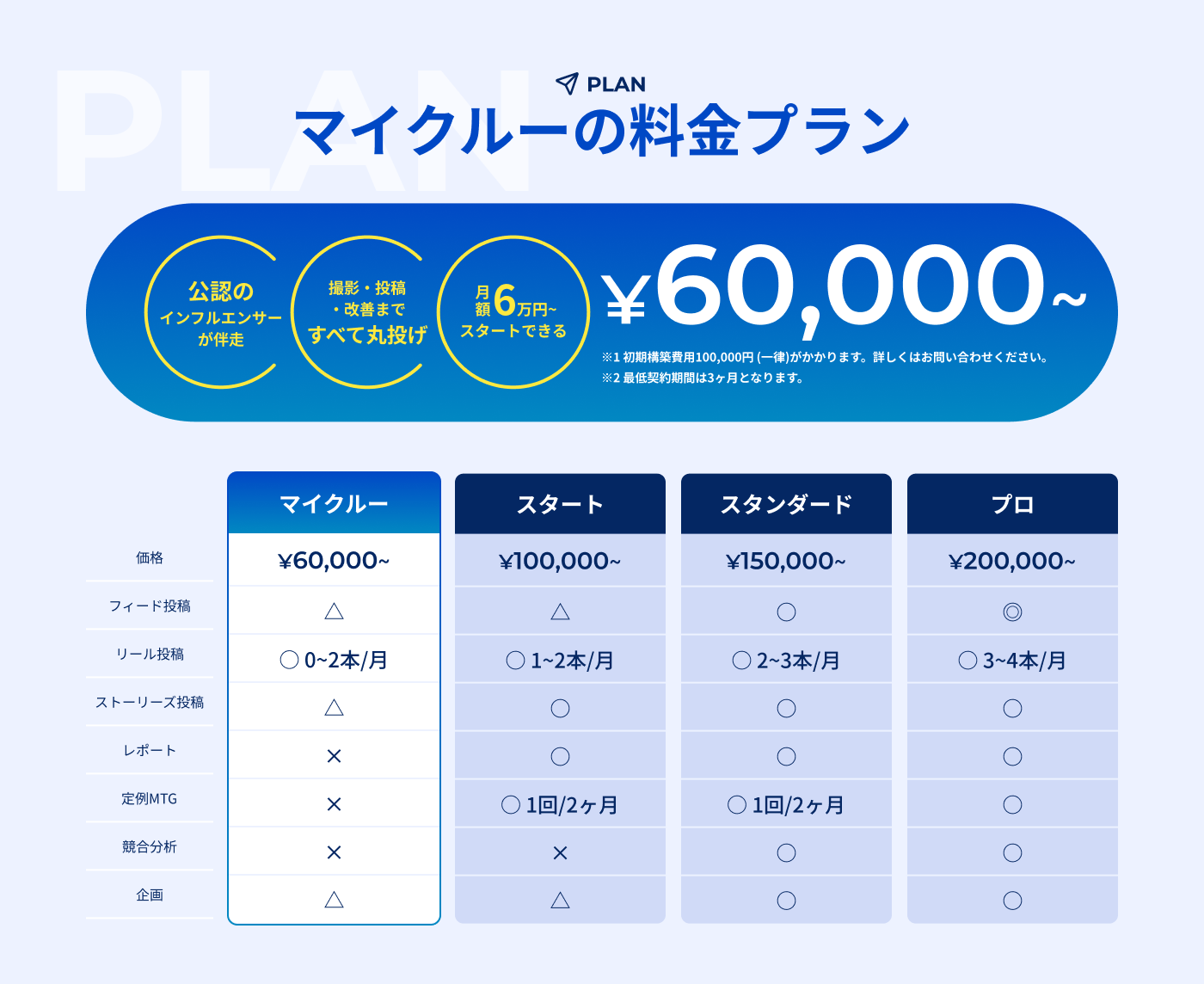 一般的な運用代行サービスの相場は、撮影込みで月額20万円前後が主流とされる中、月額60,000円という価格設定は、企業担当者目線でも導入ハードルが低く、「手が出しやすい」「まずは取り組んでみたい」という声を反映したものとなっています。