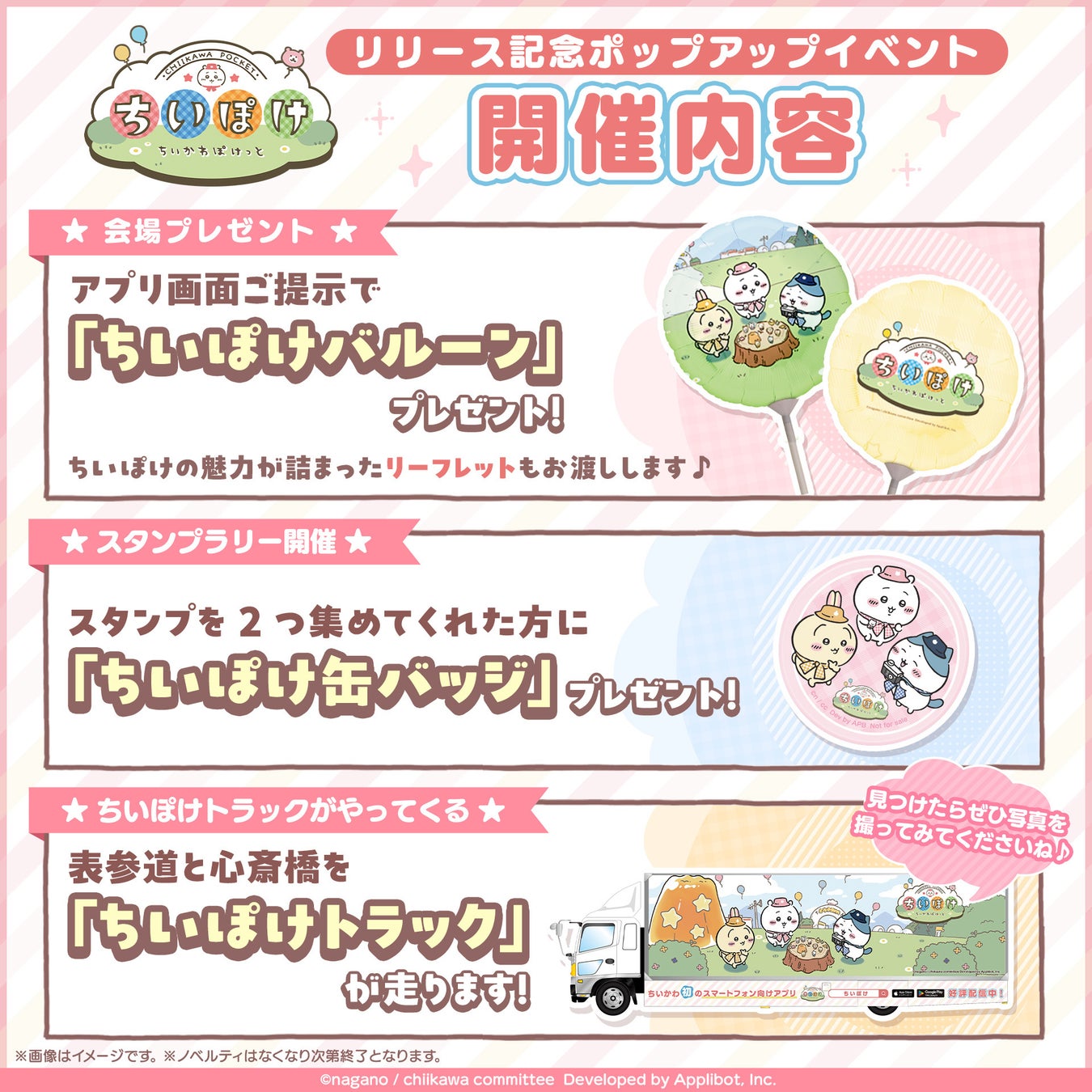 『ちいぽけ』のリリースを記念して開催する、『ちいぽけ』初のポップアップイベントの詳細を公開いたしました。本イベントは、2025年4月2日(水)から6日間の日程で、場所は、東京・表参道と大阪・心斎橋の2か所にて開催いたします。本イベントでは、「ちいぽけバルーン」のプレゼント、『ちいぽけ』のオリジナル缶バッジがもらえるスタンプラリー企画を実施する他、イベント会場周辺では『ちいぽけ』デザインのトラックが走行いたします。イベント参加方法や注意事項は公式サイトのお知らせをご確認ください。