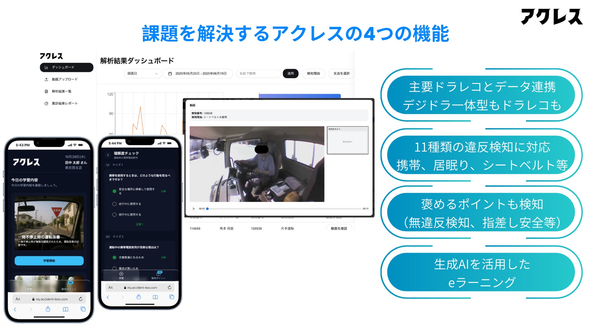 アクレスは、既設のドライブレコーダーにあとづけでAIを搭載することで、この社会課題の解決を目指す車載映像AI解析ソリューションです。既設機器を活用することで初期投資ゼロでの導入を可能にし、一時不停止やながら運転といった事故につながる危険な運転行動に加え、指差し確認の徹底のような良い運転行動も可視化できる点が大きな特長です。