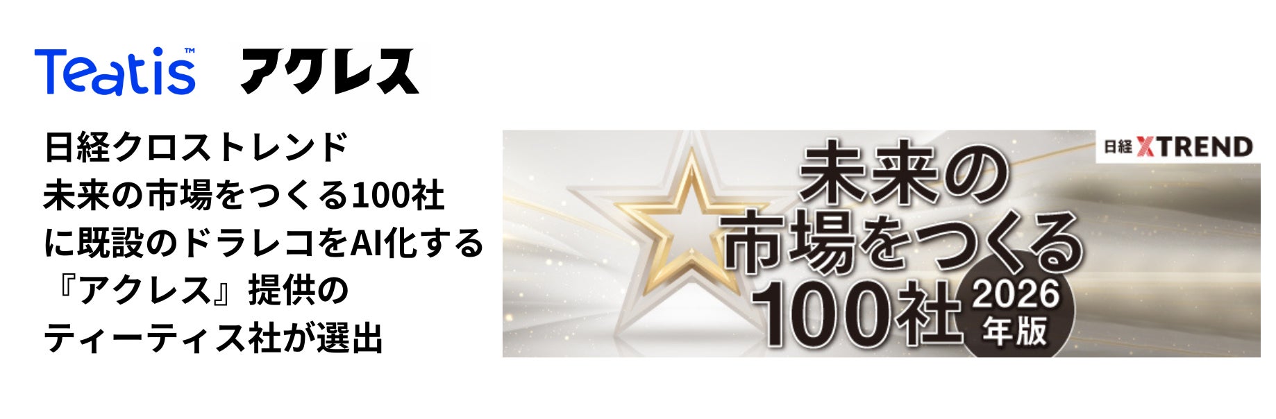 既設ドラレコのAI化を通じて交通安全革命を実現するティーティス合同会社(本社:東京都渋谷区、CEO:高頭 博志)は、日経クロストレンド(発行:日経BP社)が発表した『未来の市場をつくる100社【2026年版】』に選出されたことをお知らせします。