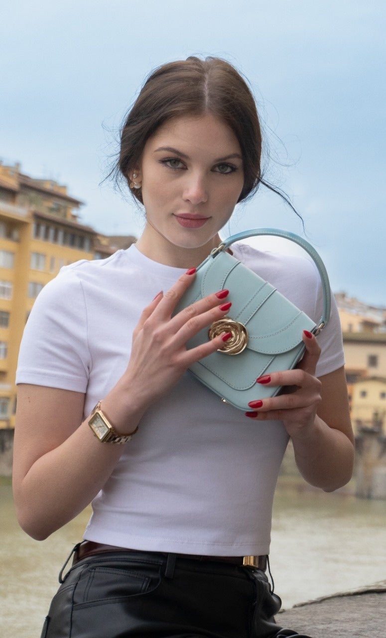 「ポンテ・ヴェッキオの時を刻んだ暖色の建築と、アルノ川の揺れる水面に映るスカイブルーのコントラストが、このバッグにさらなる静けさと洗練をもたらしています。」